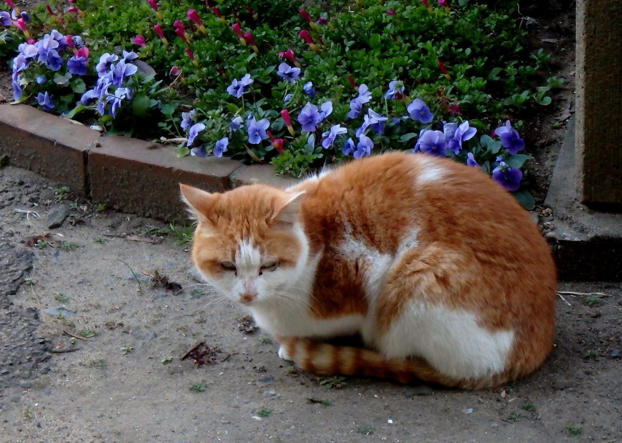 他所様の庭先で、ビオラをバックに赤白猫が休んでました。
