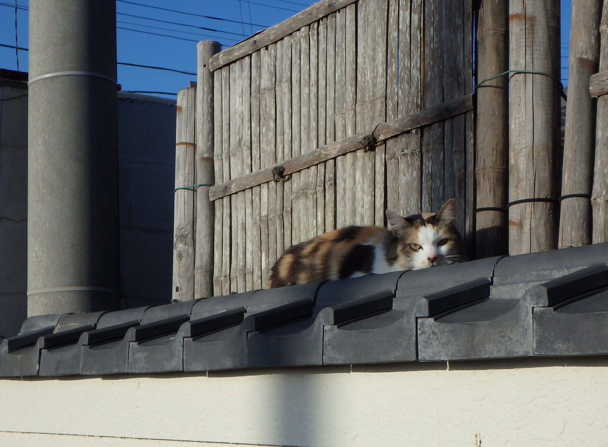 これもいつもの吊目で、カメラを見てます。塀の上で見張ですか?