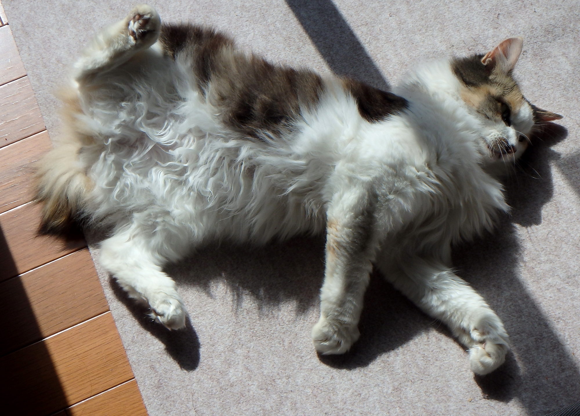 居間の日向で、ゴロゴロとご機嫌。この後は、毛づくろいの時間です。