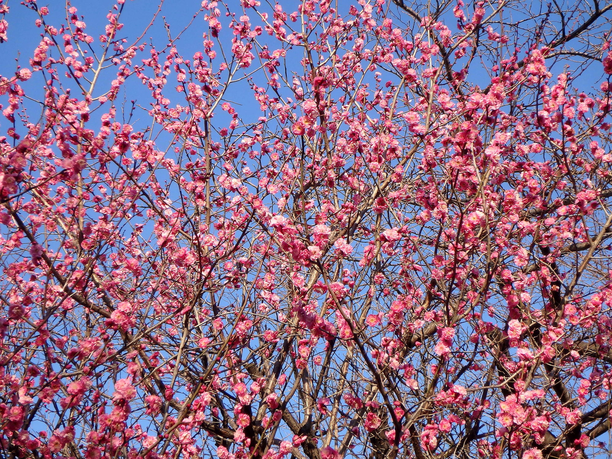 青空には、紅梅が咲き誇ってました。メジロが来てました。