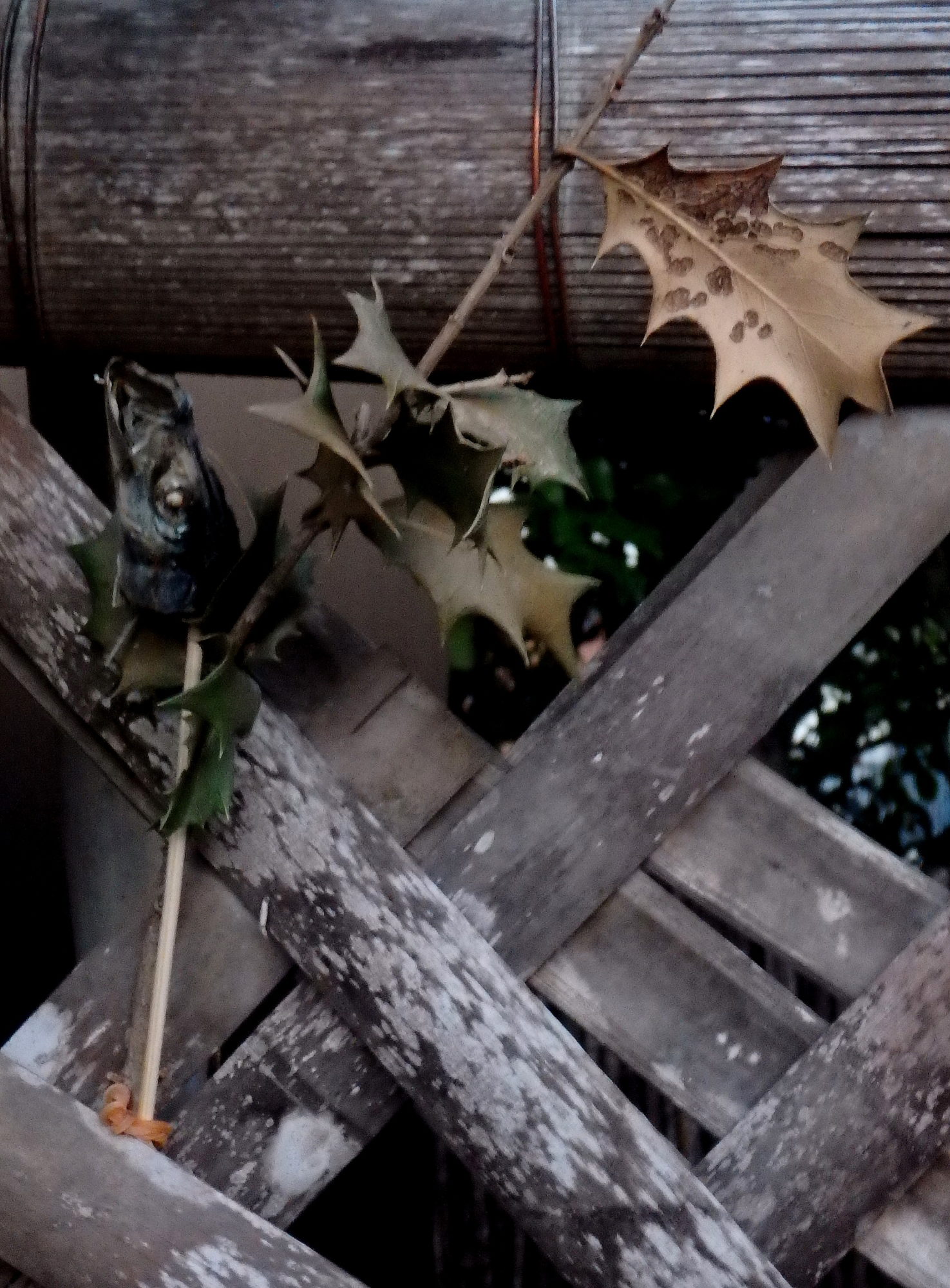 庭の植え込みに入って、柊の小枝を数本用意しました。イワシの頭を着けて飾ります。節分の魔除けです。