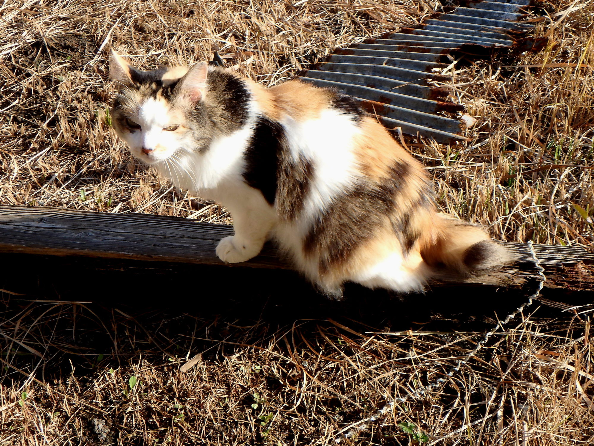 眩しいせいか、ニャン相が悪~い、外のいつもの爪とぎの木の上で。