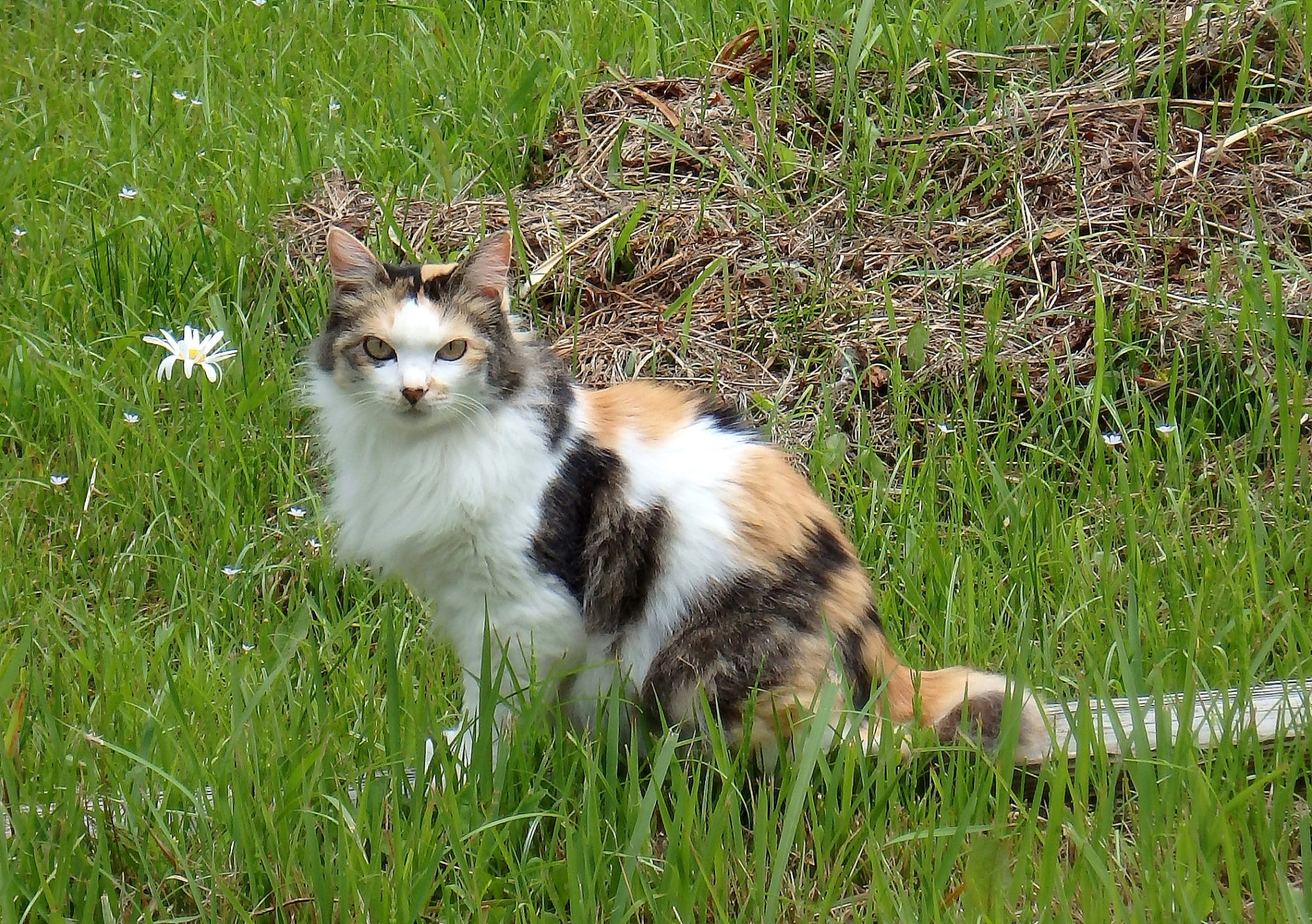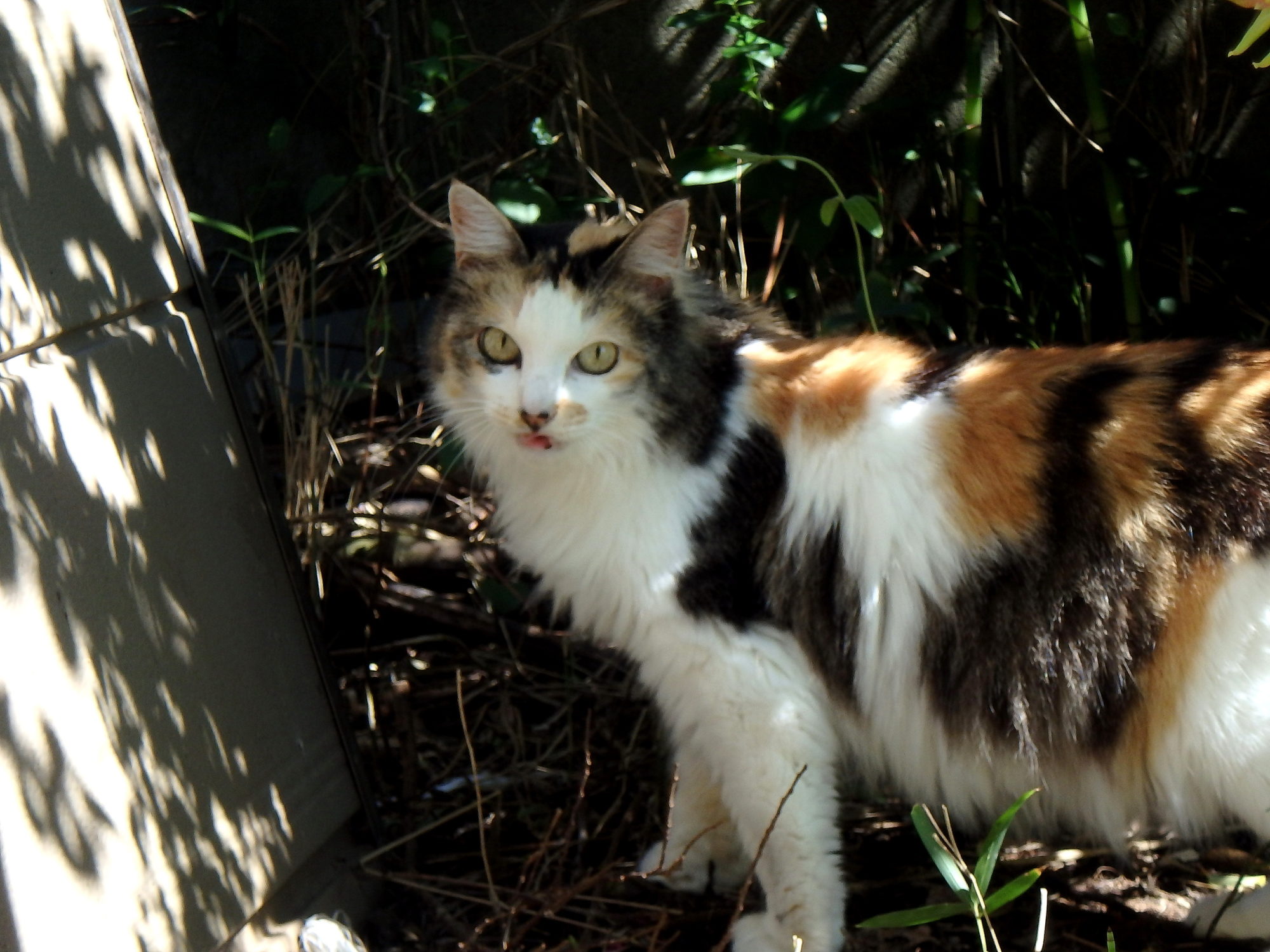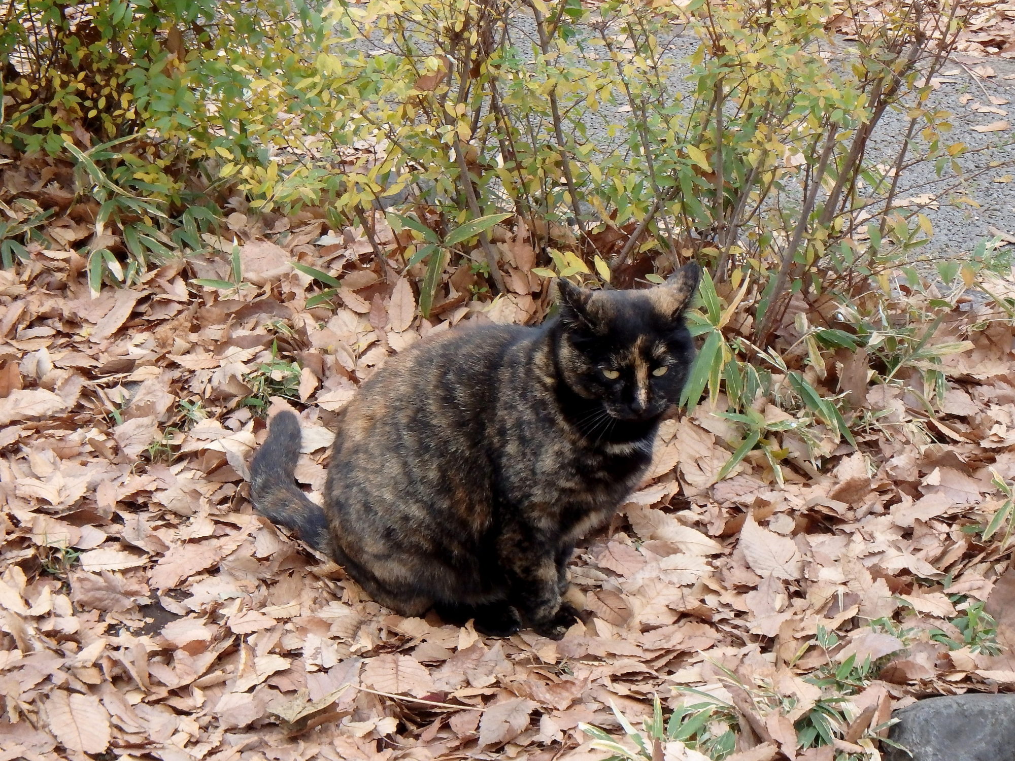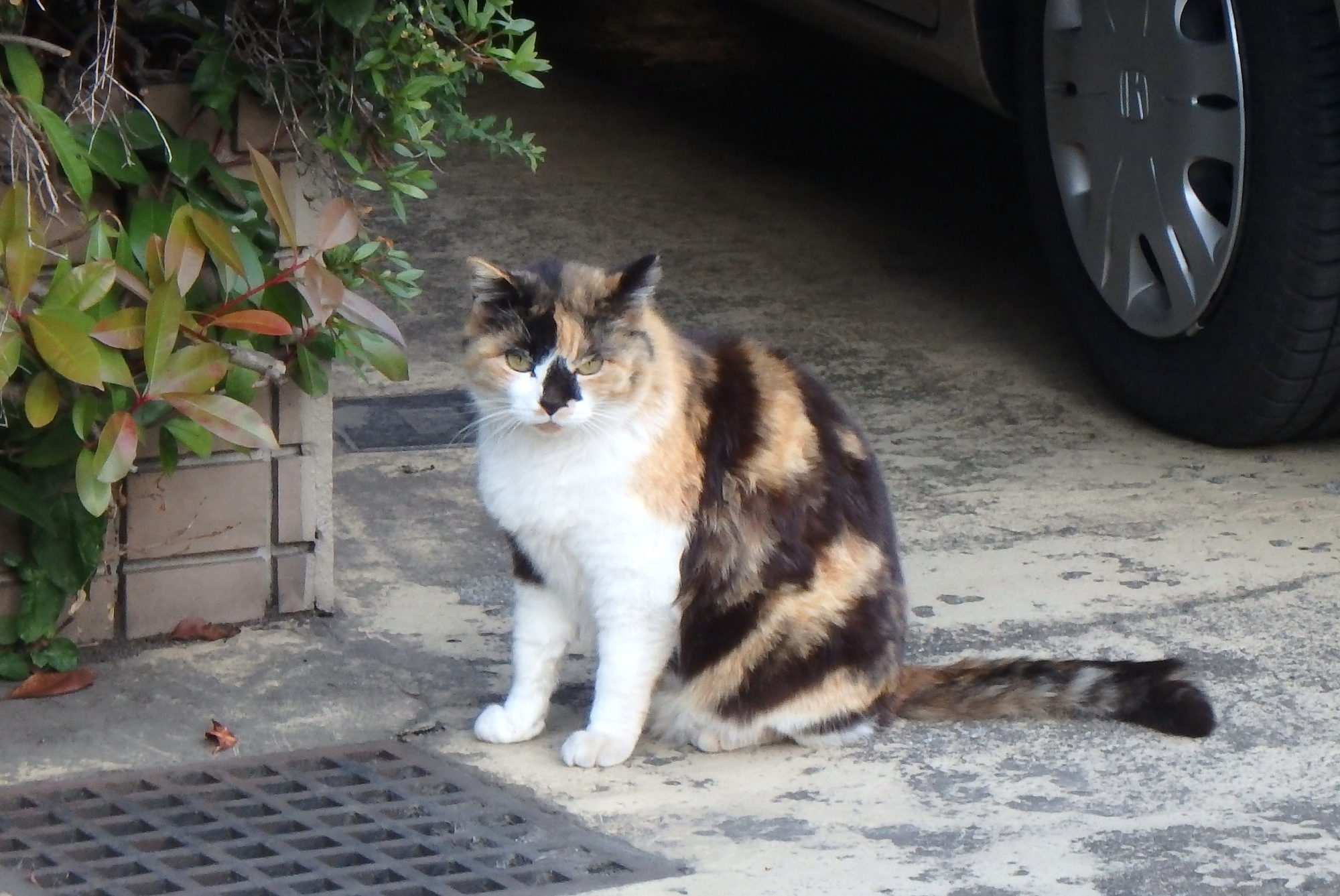 パートの途中で会いました。雄なら珍しい三毛猫ですが…?