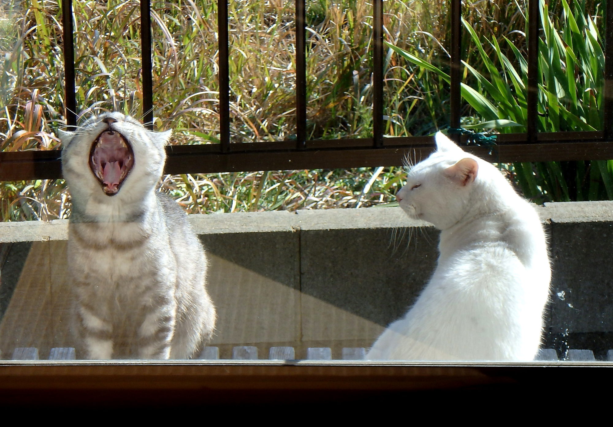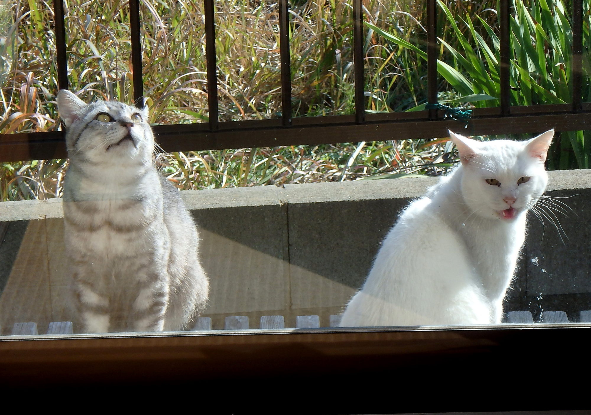 毎度遊びに来る、縞猫と白猫です。(=^・^=)白「おはよー」(=^・^=)縞「あれ、何か飛んでいる?」