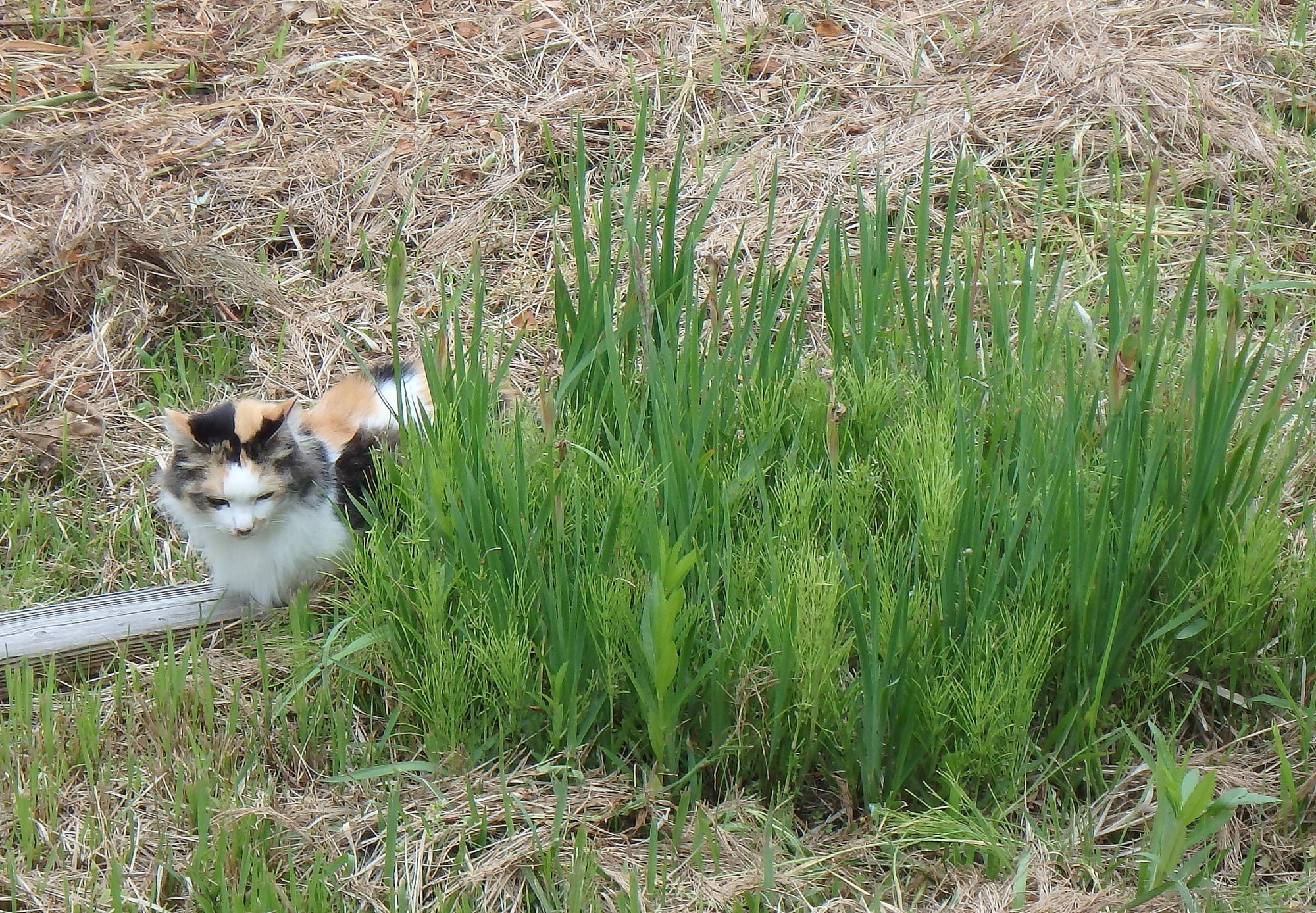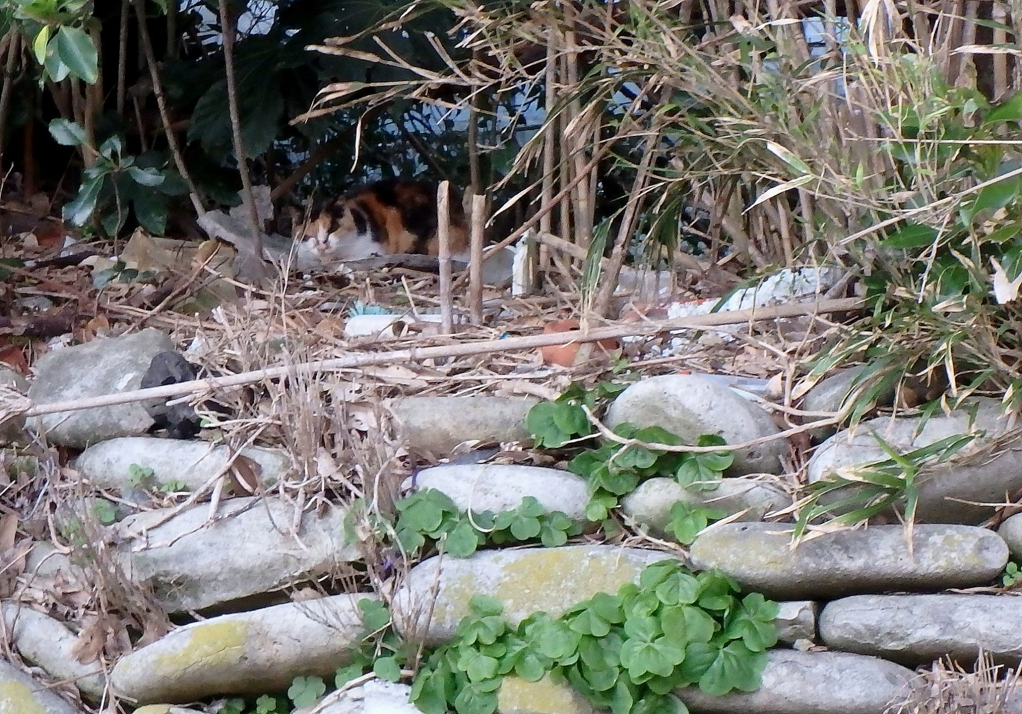 視線を感じました。三毛猫が薮に潜んでます。(=^・^=)「見張り番なの!」