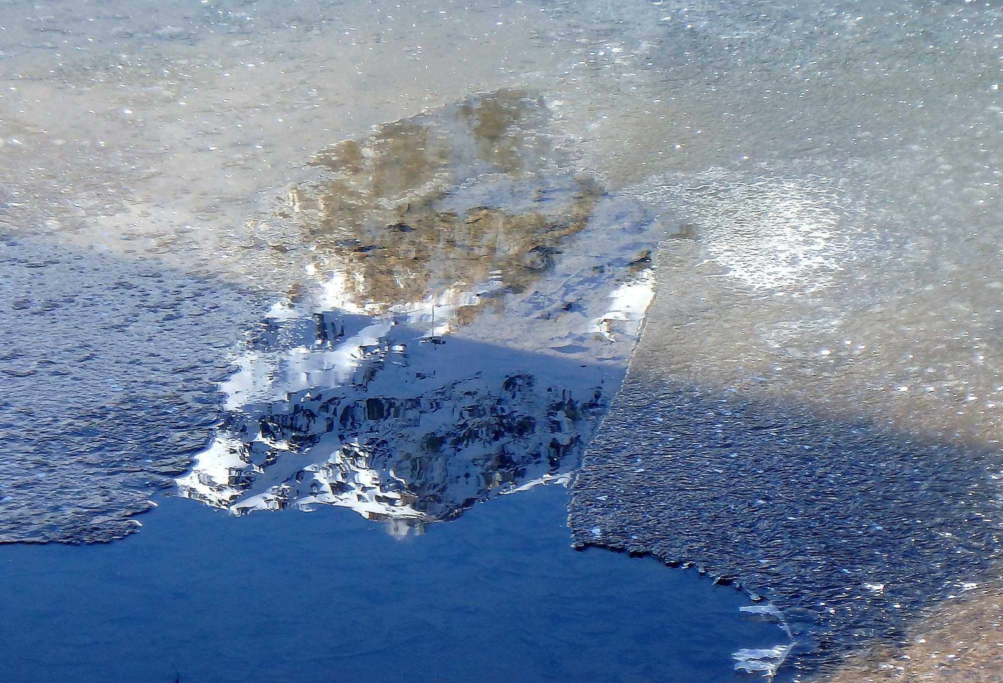 大正池の氷の割れ目に、焼岳の頂が投影されてます。