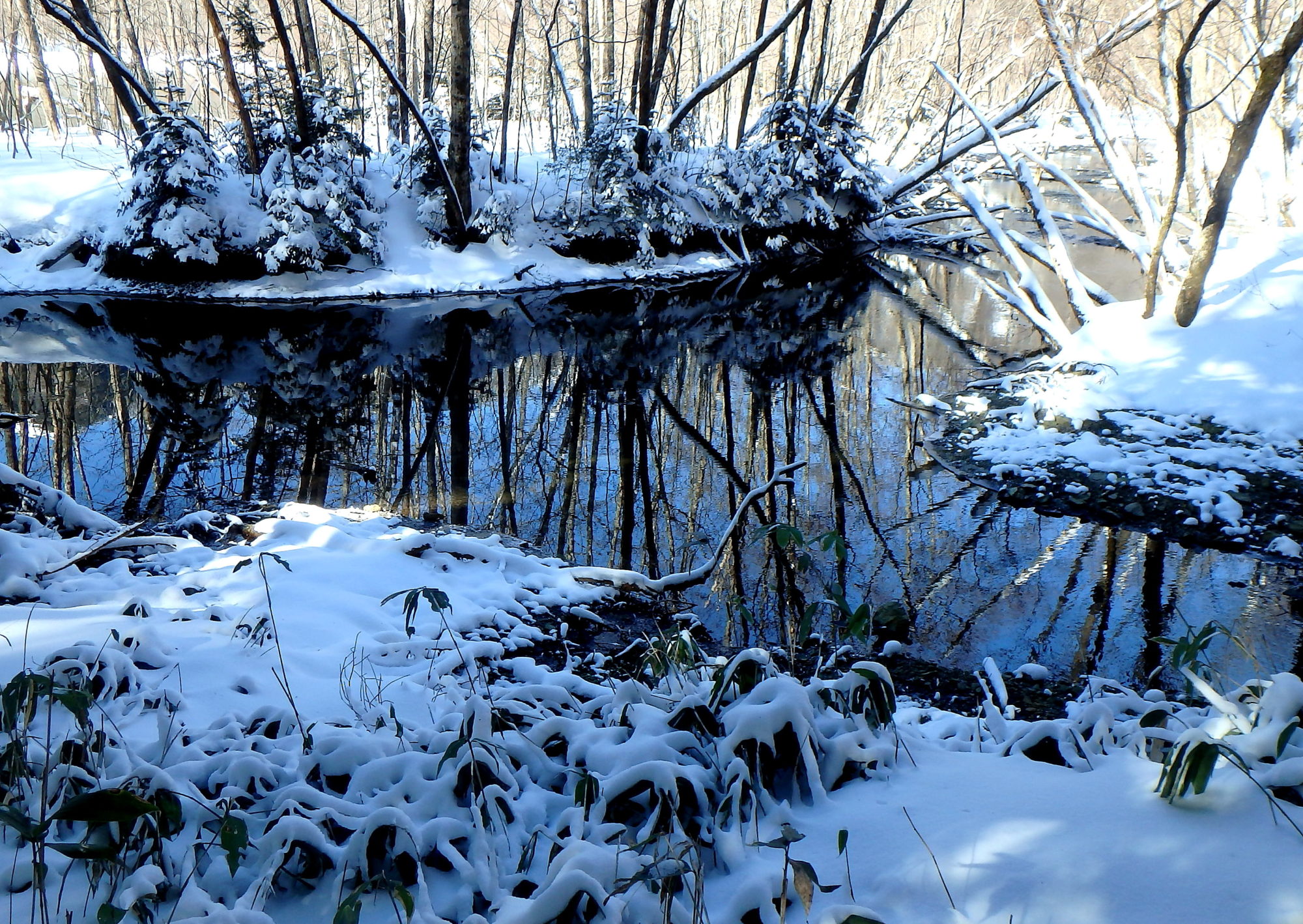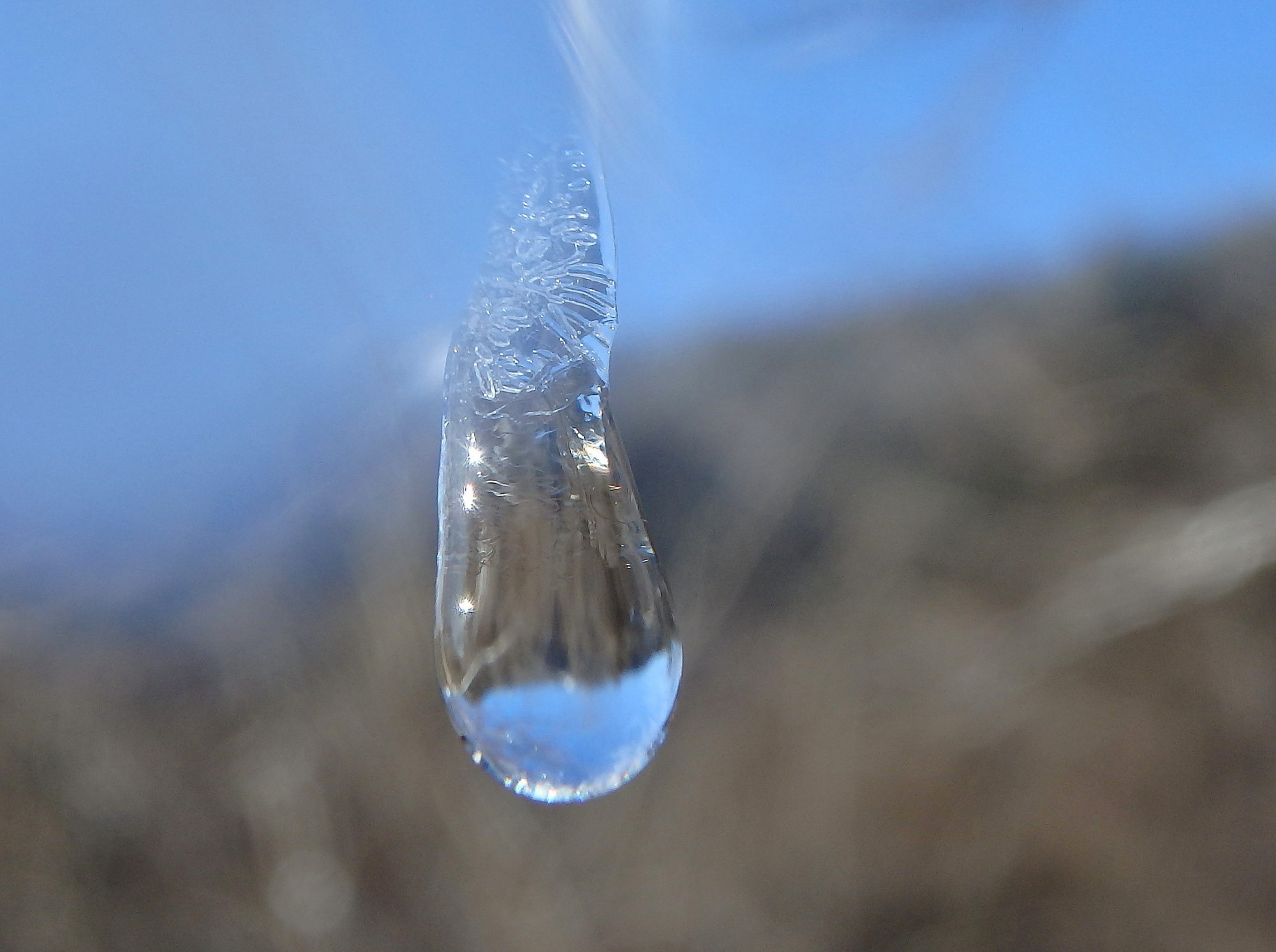 この雫は、氷柱から落ちてます。雫には周囲の樹々が写り込んでます。1月のフォトの旅は上高地です。