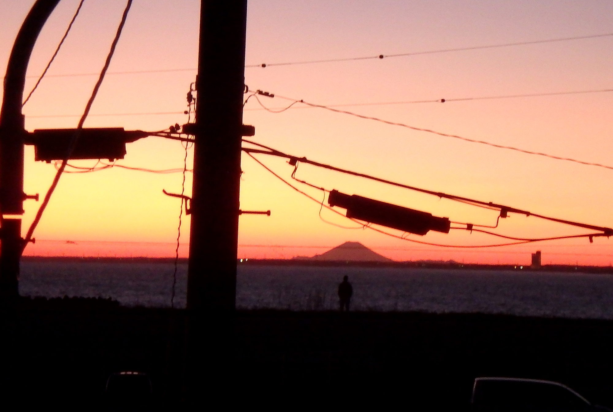 2階の窓から富士山が見えました。夕景に佇む人も…。