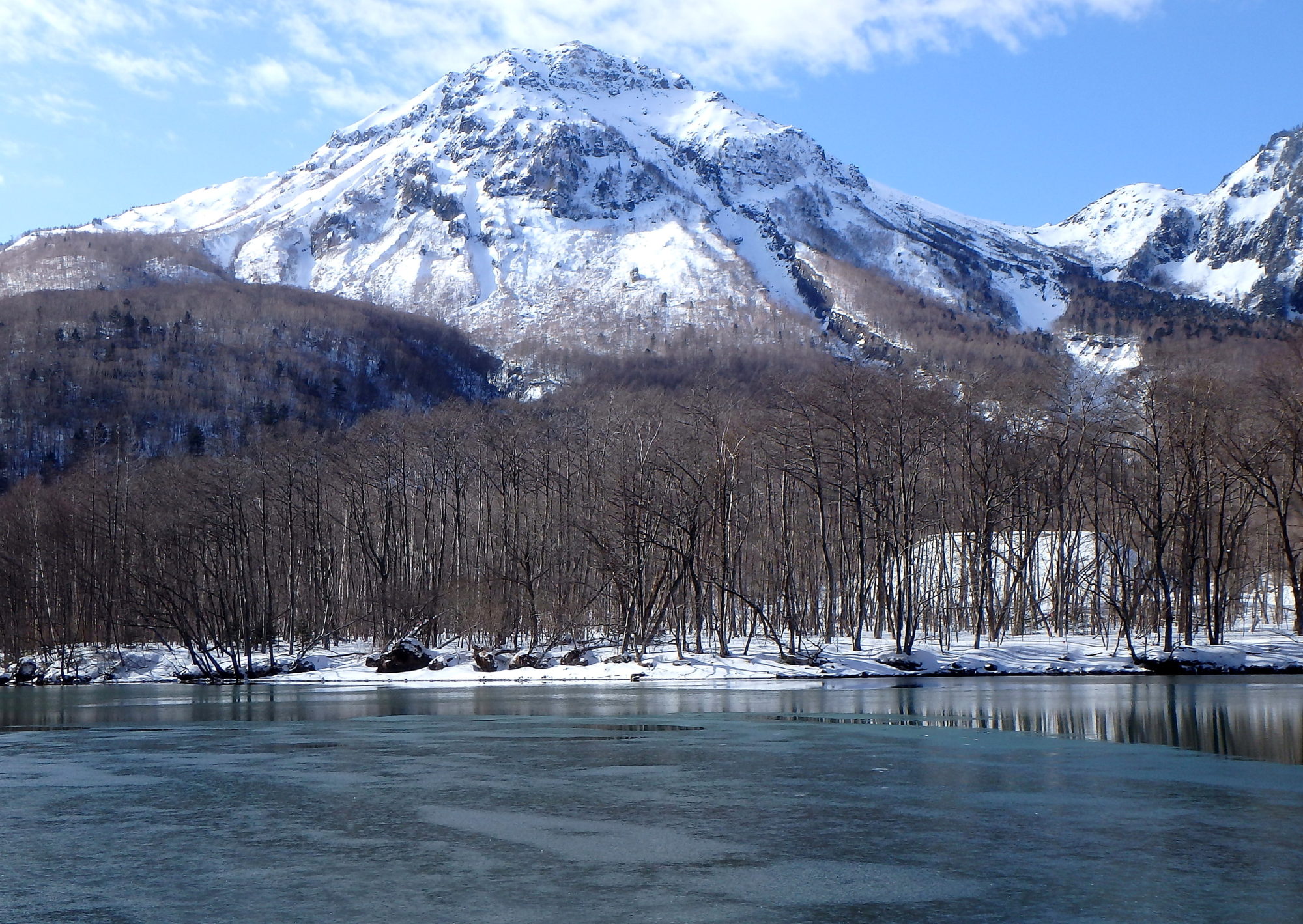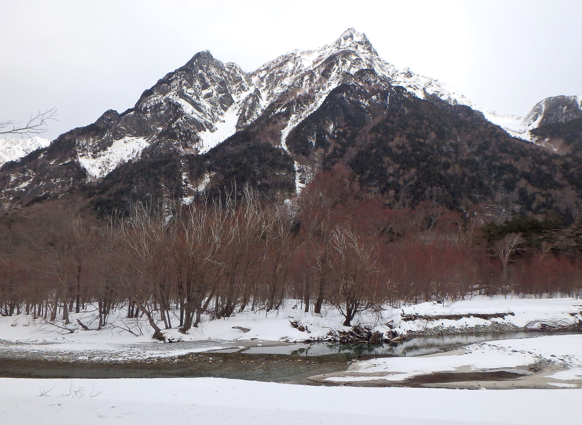 初日は天気が良く、焼岳も美しかったです。雪は少なかったです。