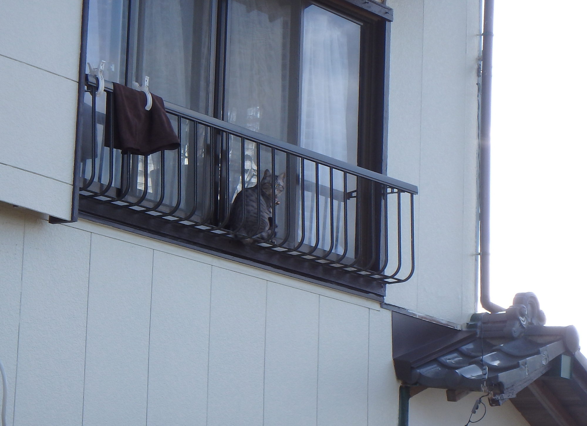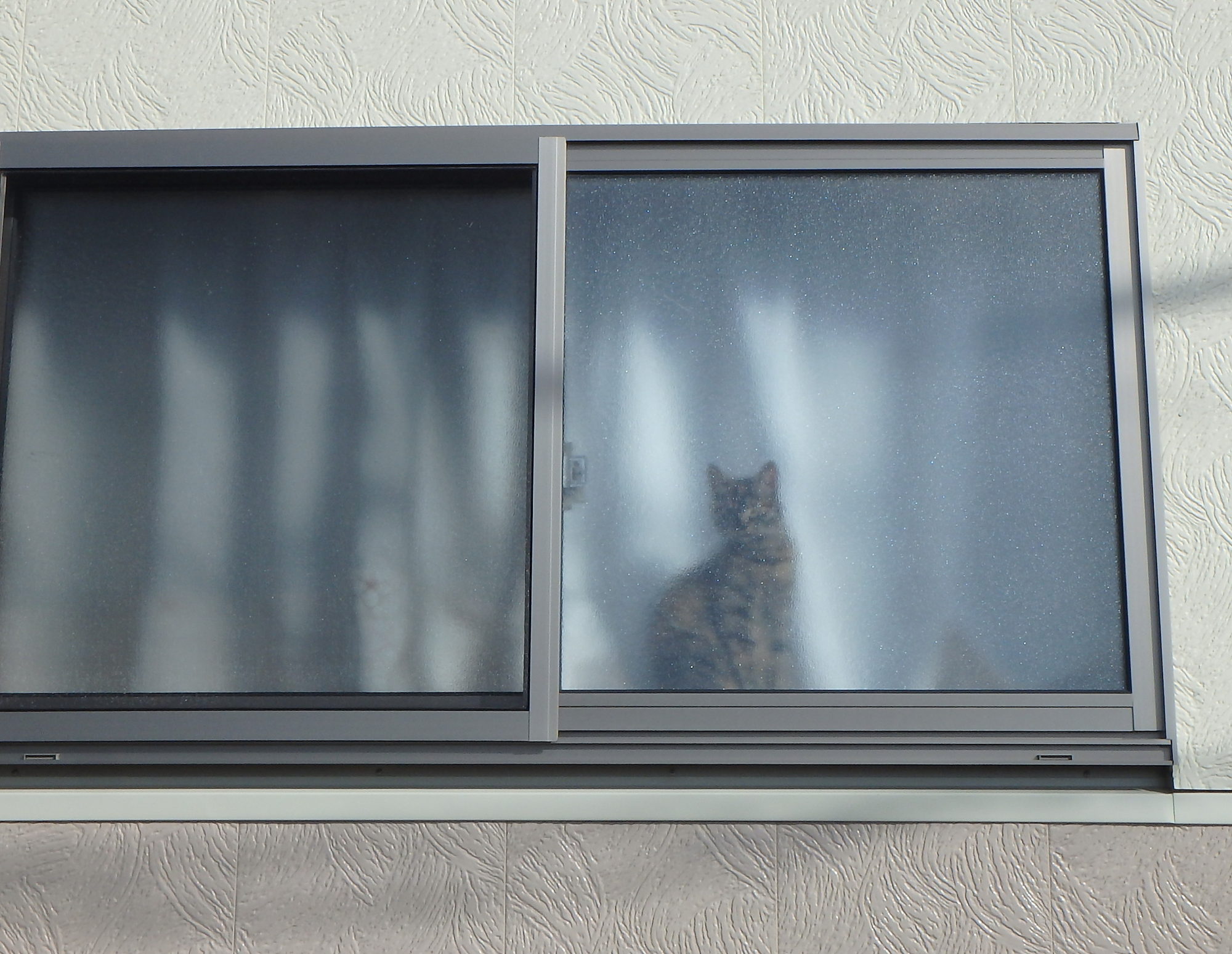 隣の家の(=^・^=)さんが窓からこちらの様子を窺ってます。