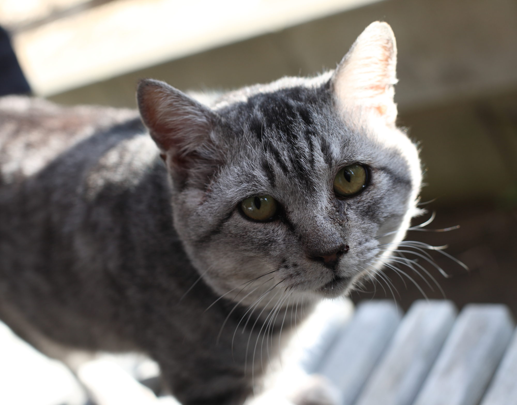 前にも登場した縞猫さんですが、鈴をつけてました。目パチクリのご挨拶。