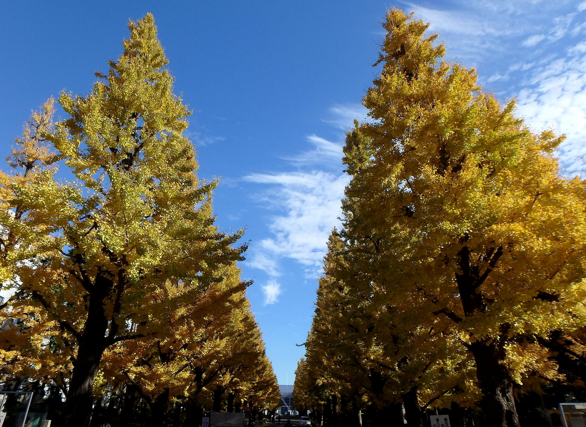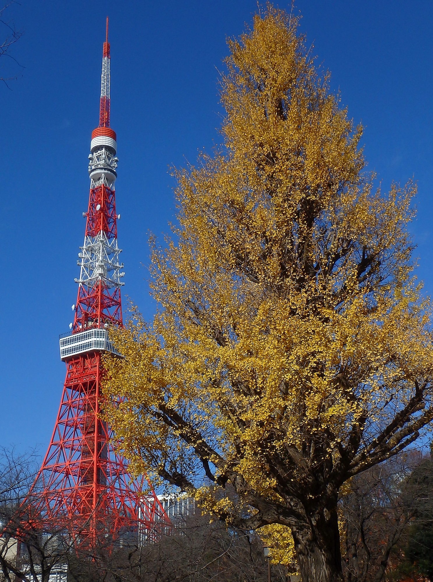 東京の紅葉は12月ですね。青空に映える公孫樹と東京タワーの背比べ?