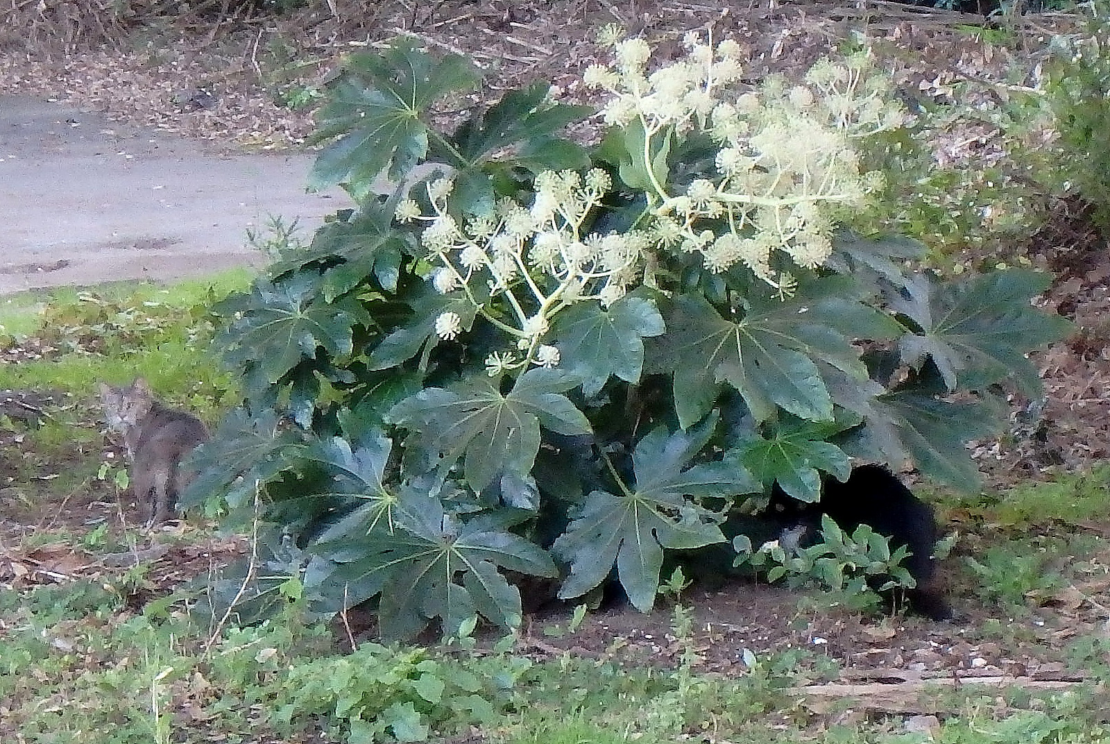八ツ手の陰に黒猫さんと灰色猫さんが、かくれんぼ。(=^・^=)黒&灰色「邪魔しないでね!」