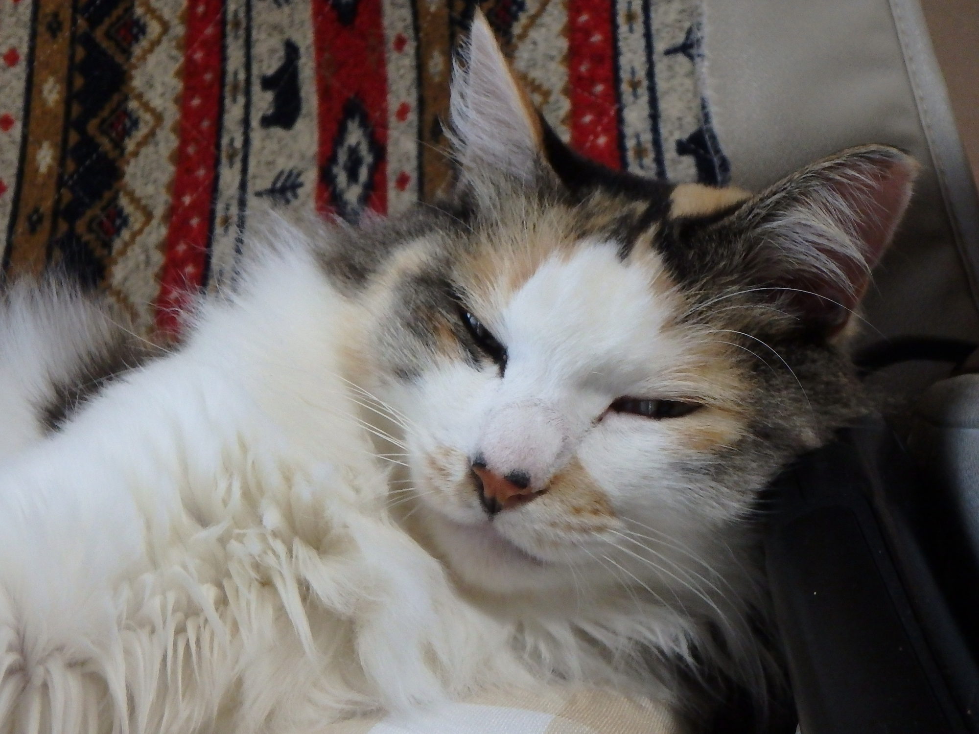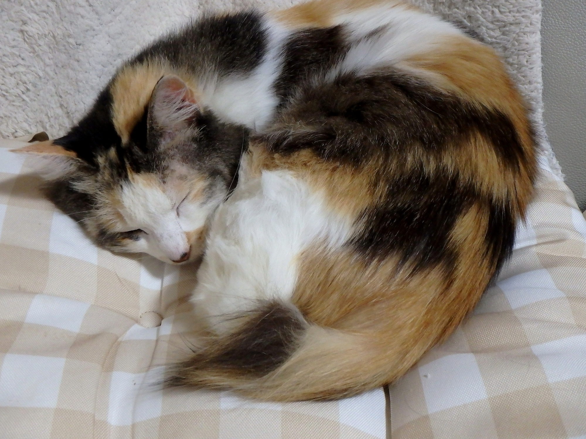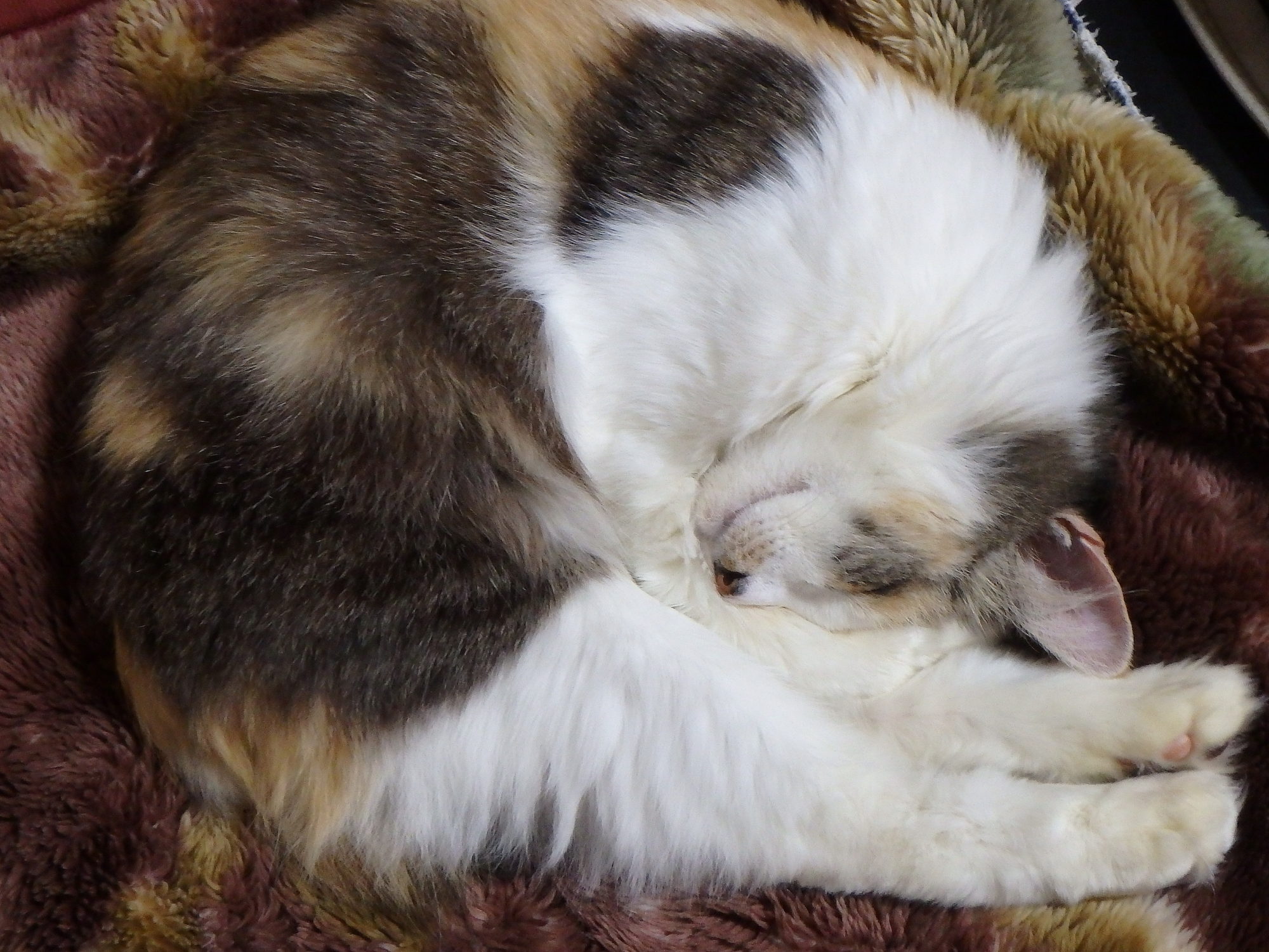 2019年12月を迎え、ミーも医者にかかったり薬のせいもあってか、生気を取り戻した感じです。丸くなって寝てますが、少し冬毛になってきてます。(=^・^=)ミー「スースー