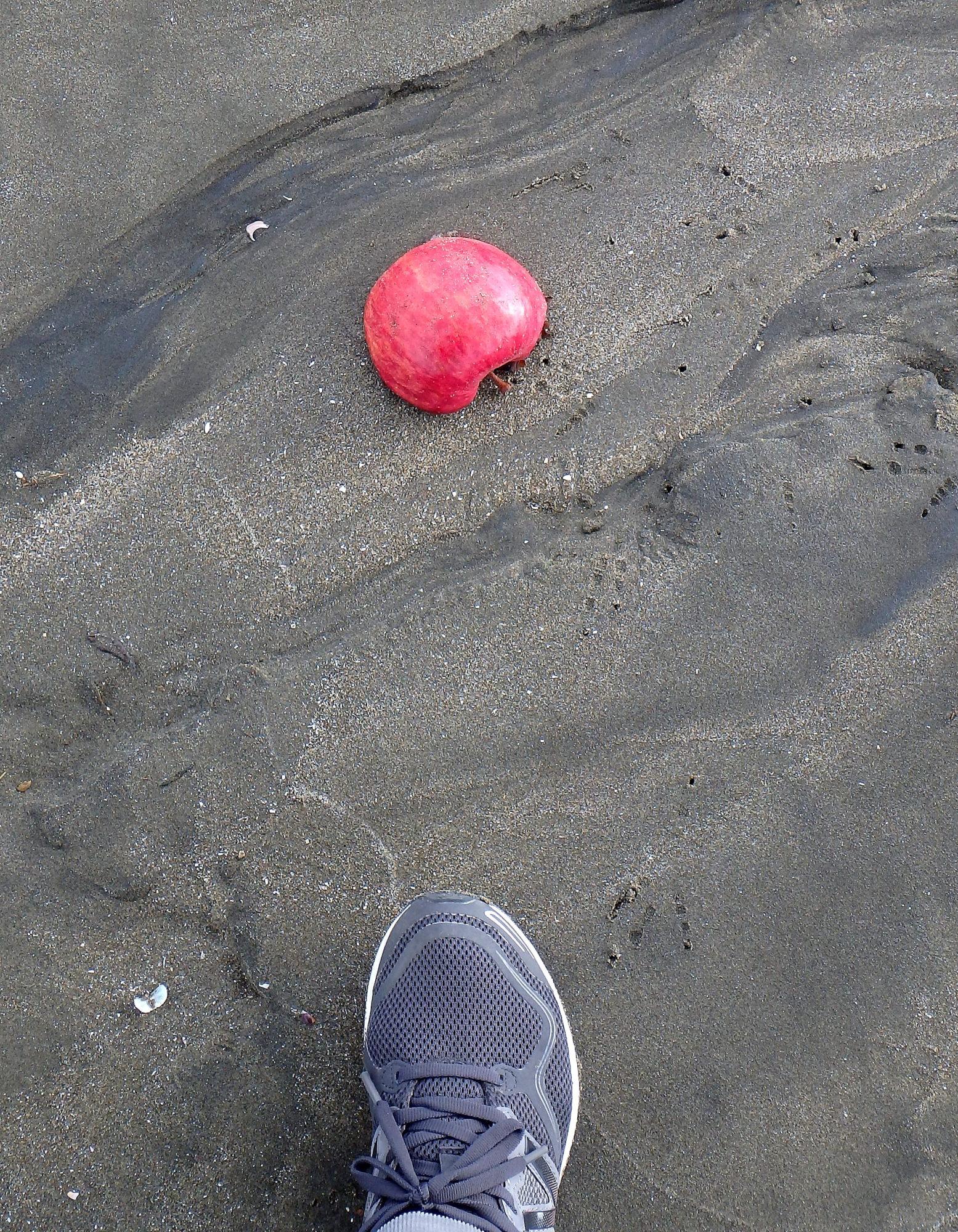 散歩する海岸には、漂流物がたくさんあり、なぜかリンゴが?