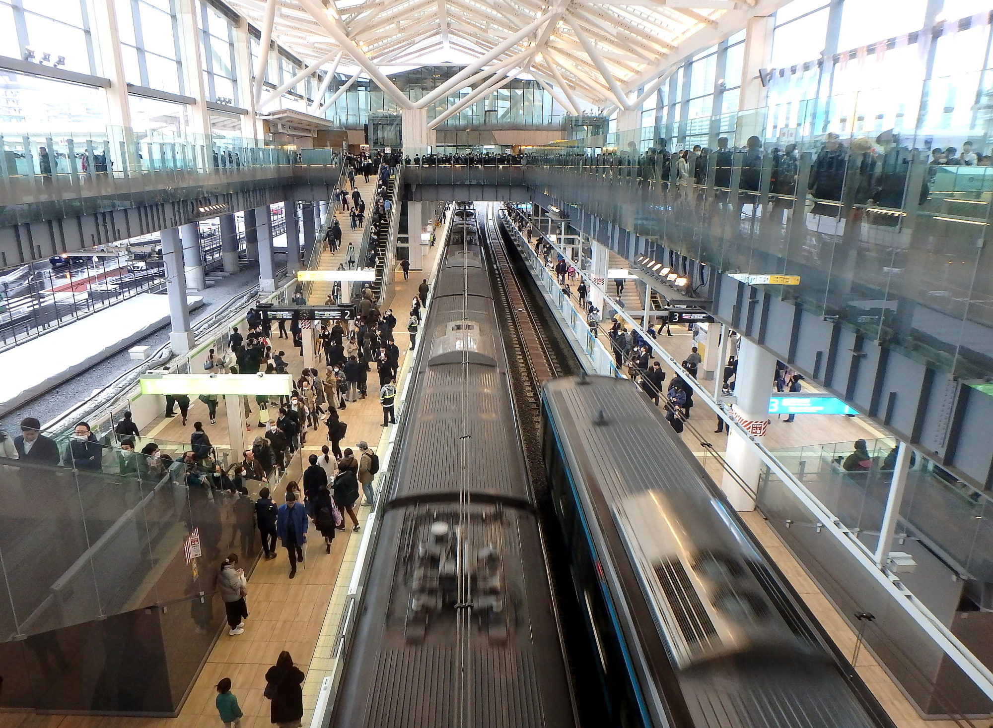 3月14日は新駅誕生でしたが、みぞれ模様でした。コロナウイルスの最中ですが、構内は人出が多かったです。私は、移動途中に立ち寄りました。