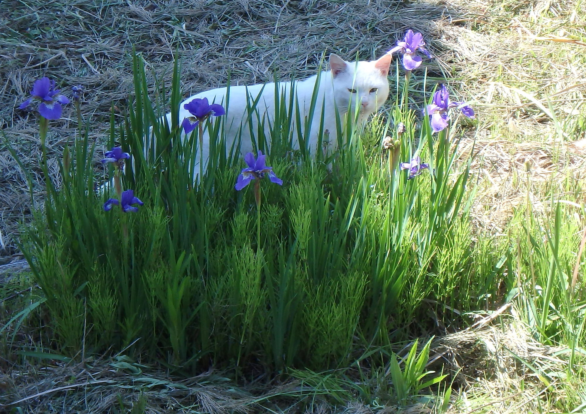 いつもの白猫さんが、散歩の合間にカキツバタの茂みからこちらを見てます。青と白のコントラストが爽やかです。上と同じ茂みですが、こちらは上の4日前でしたので、花が咲いてました。