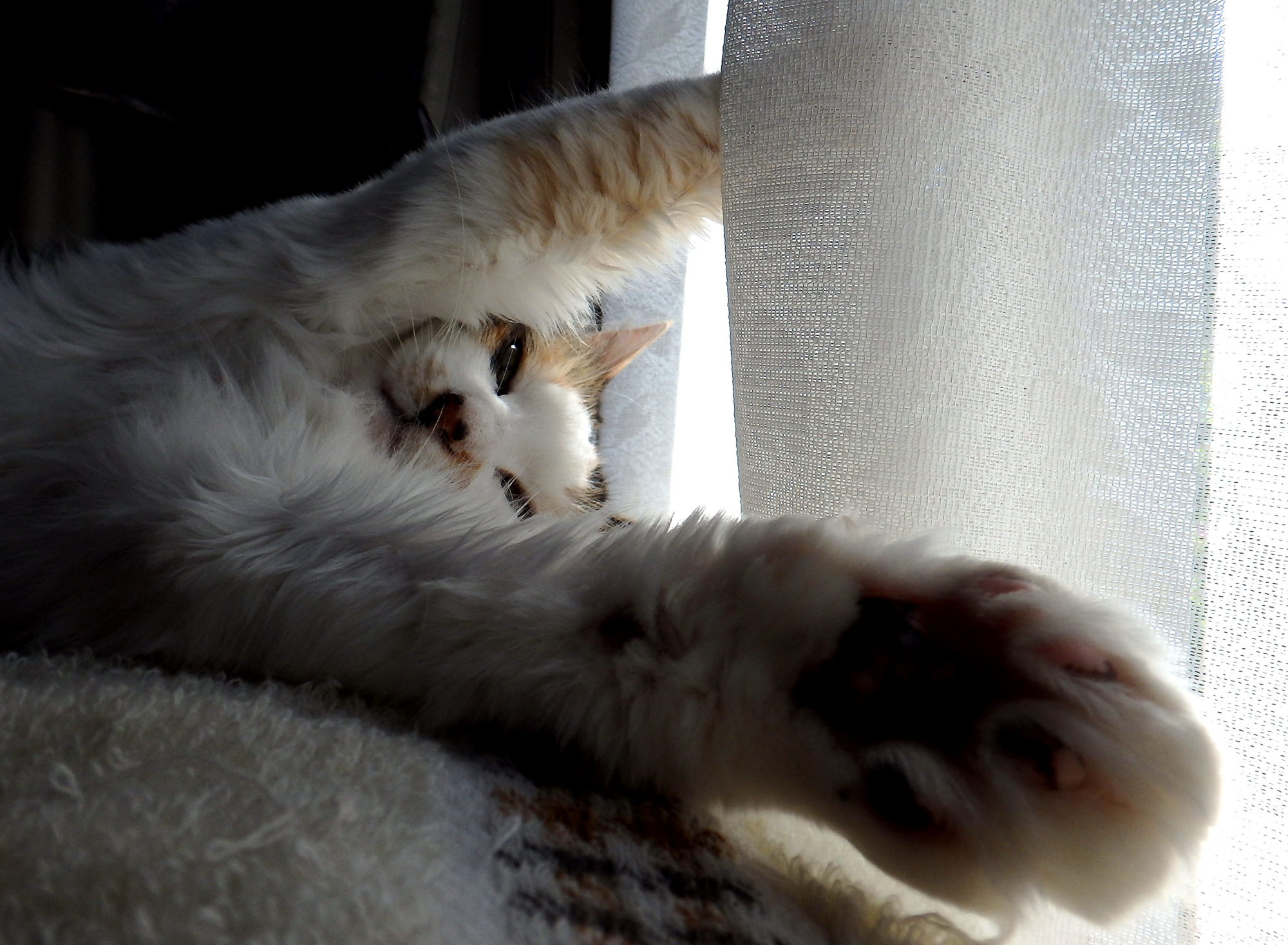 ベットの上で伸びていたら、片手がカーテンへ…。