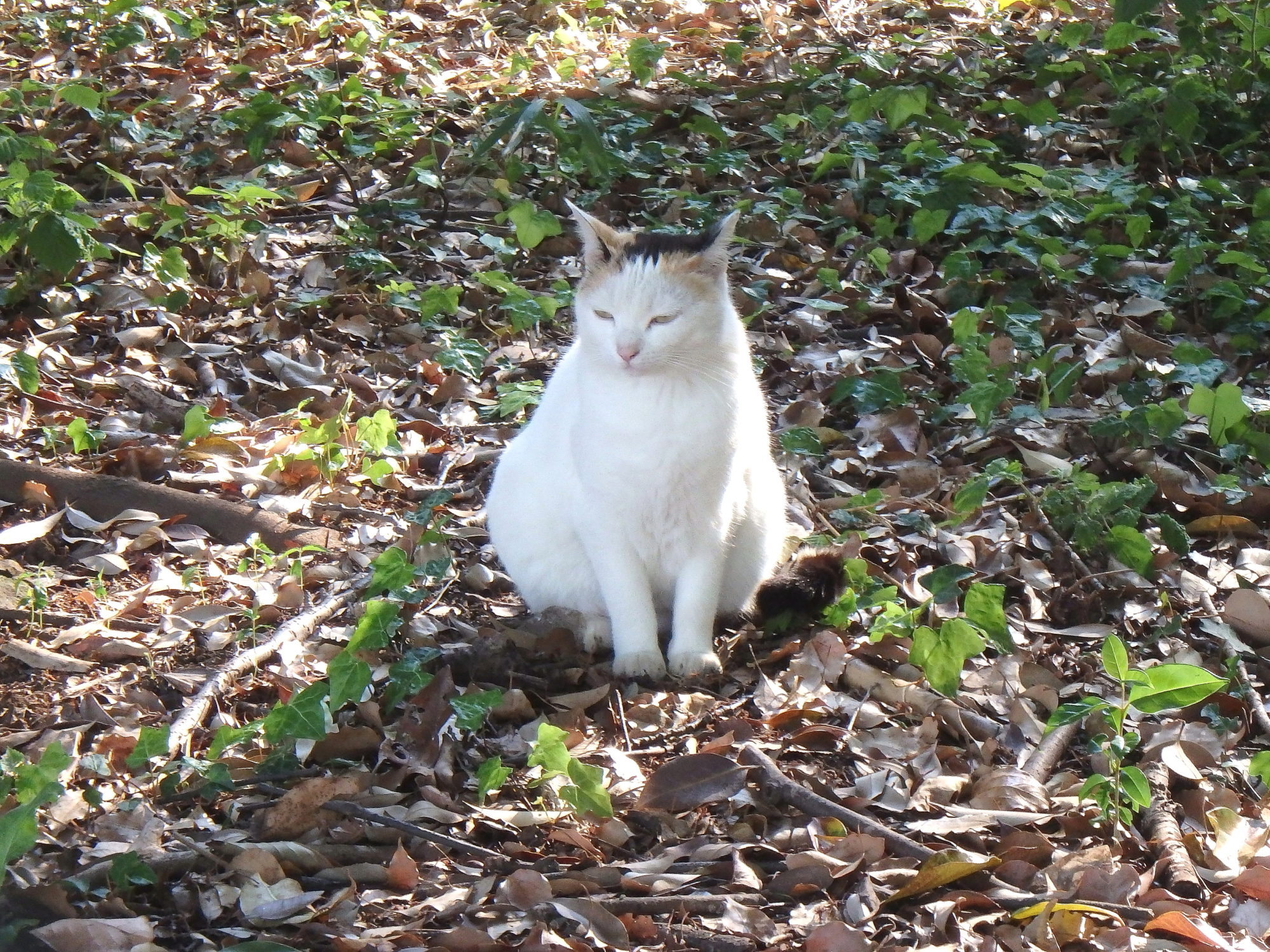 こちらも公園にいる栄養満点?な猫ですが、日差しの中で気持ち良さそうに座ってました。人が入れないところですので、安心しているのかも。