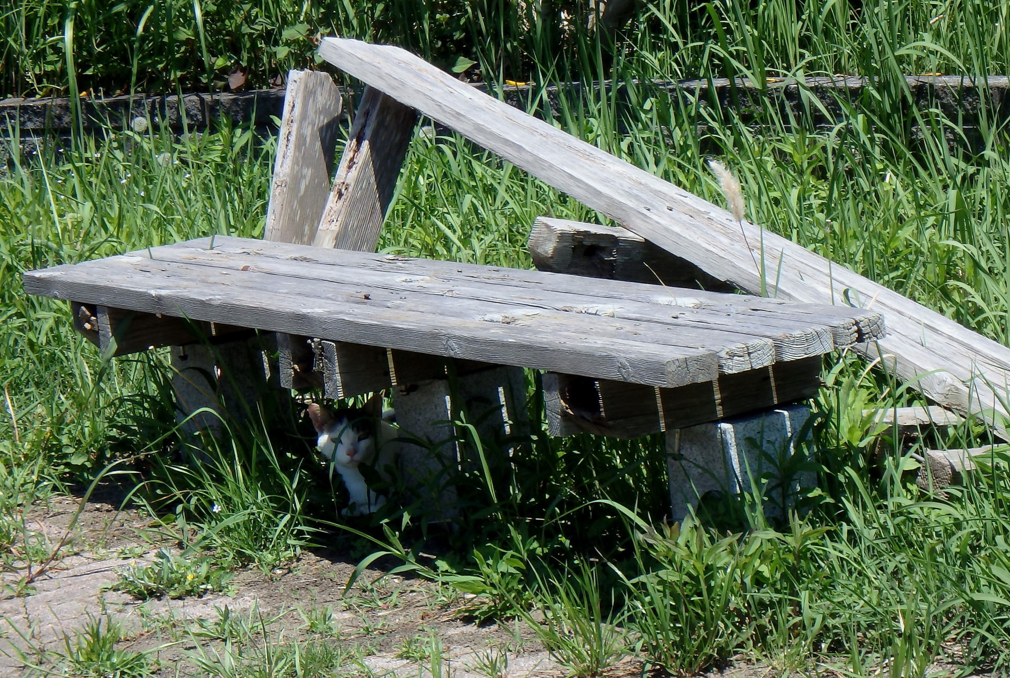 日差しをよけて、公園の壊れそうなベンチの下に隠れている猫さんです。