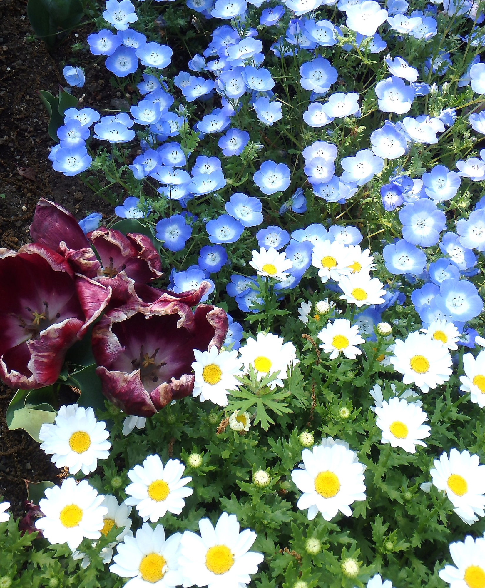 花々が美しい時期の外出自粛は、実にもったいない。近場の花々を撮りました。公園の花壇の寄せ植えでは、ブルーのネモフィラが中心に。