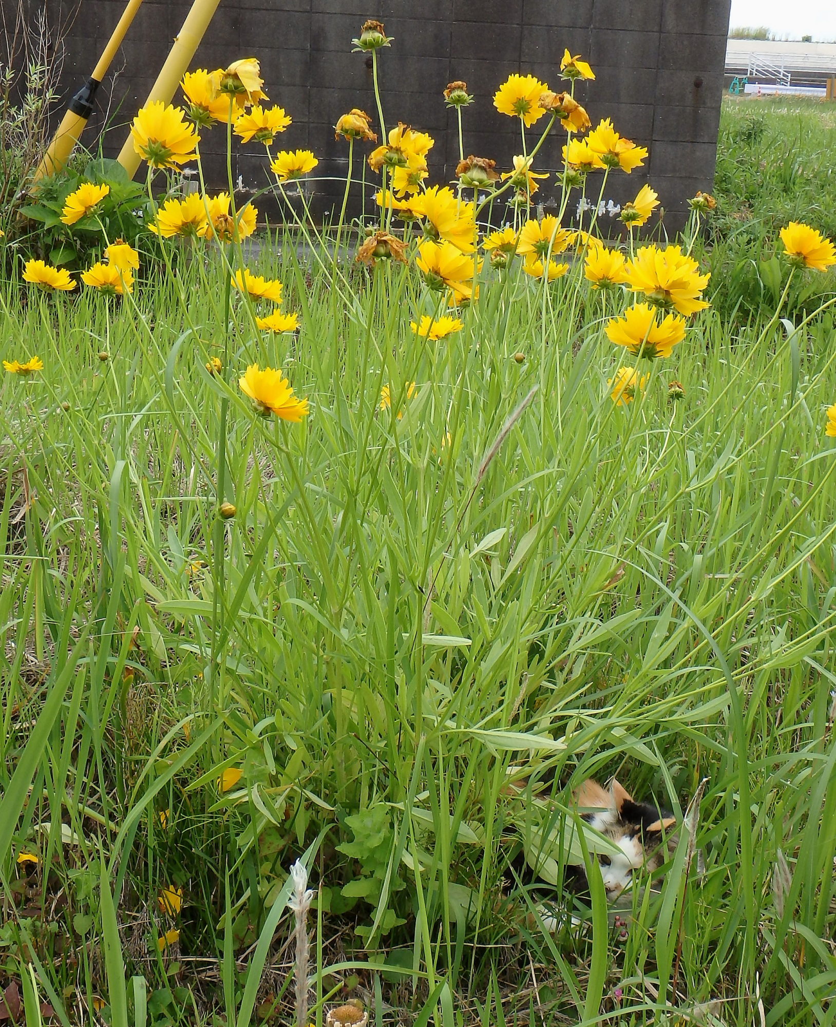 ミーは、探したらキバナコスモスの茂みに隠れてました。昼寝中であったかも。