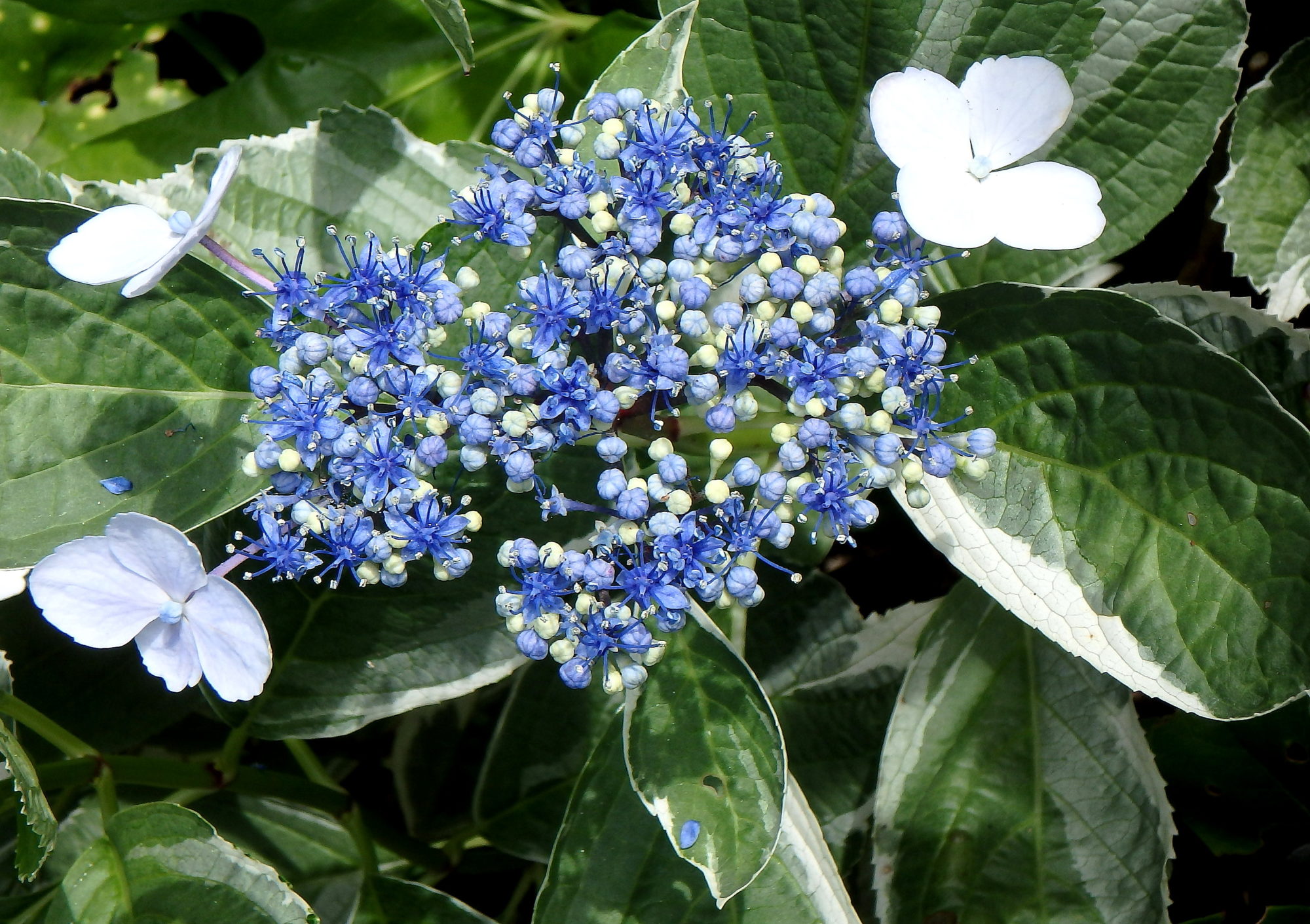 葉に斑入りの紫陽花です。庭には5種類くらいの紫陽花があります。