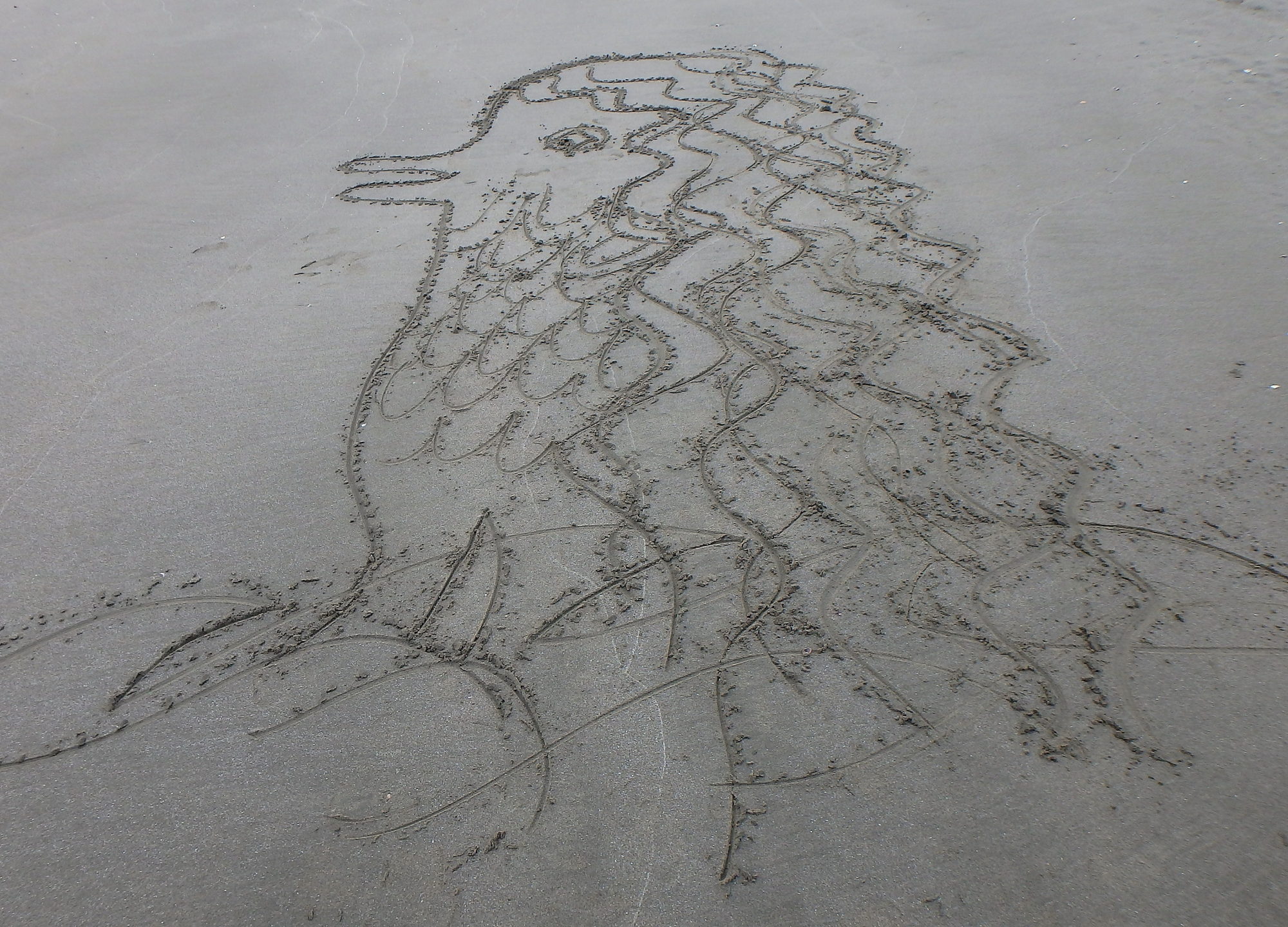 コロナ禍の折、緊急事態宣言は解除になりましたが、砂浜にアマビエを描いてみました。