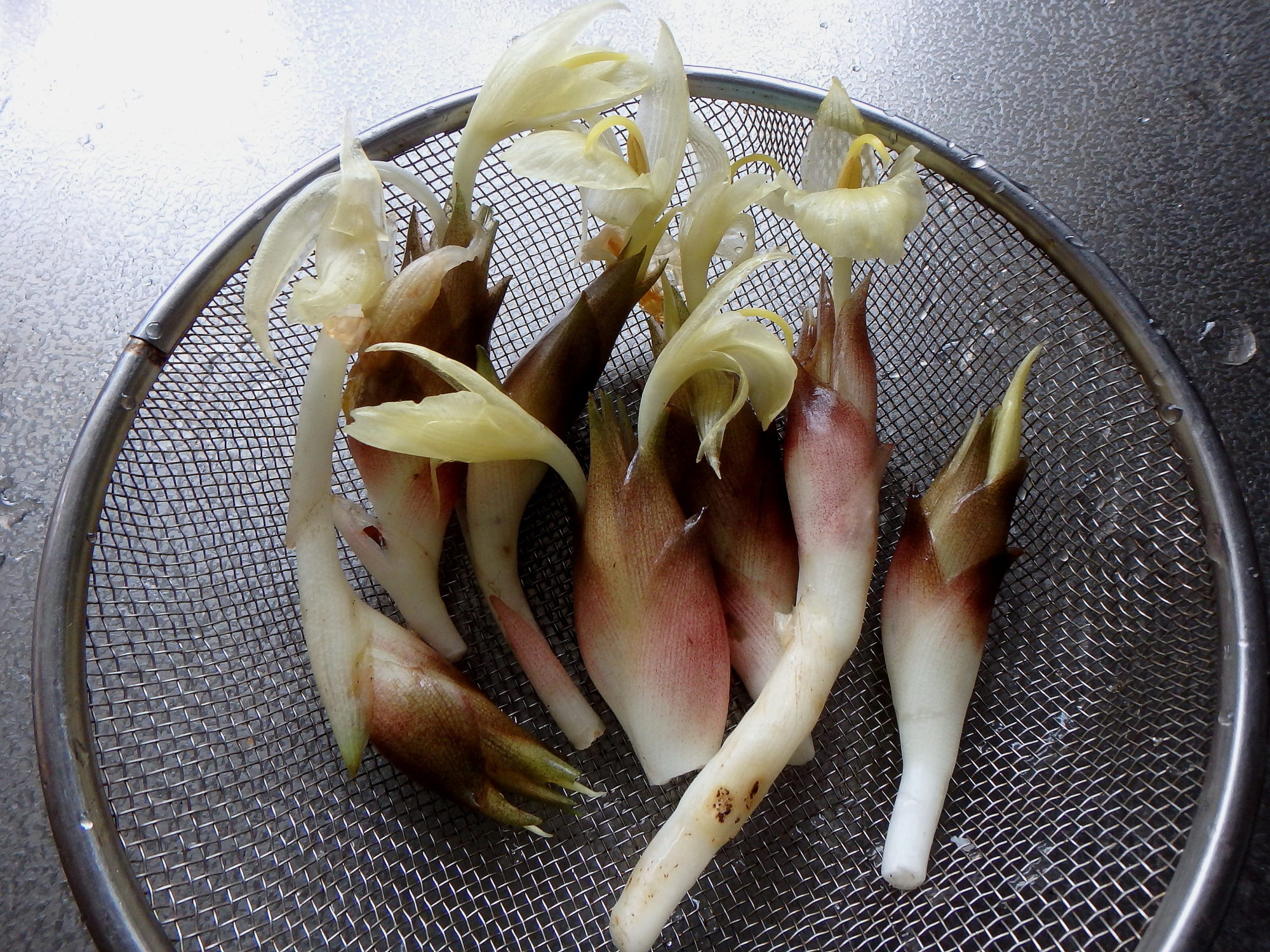 雨模様であったので、気がつかないうちに茗荷の花が咲いていた。収穫して、そうめんの薬味、冷やっこのトッピング、玉ねぎと海老でかき揚げにして美味しく食べました、