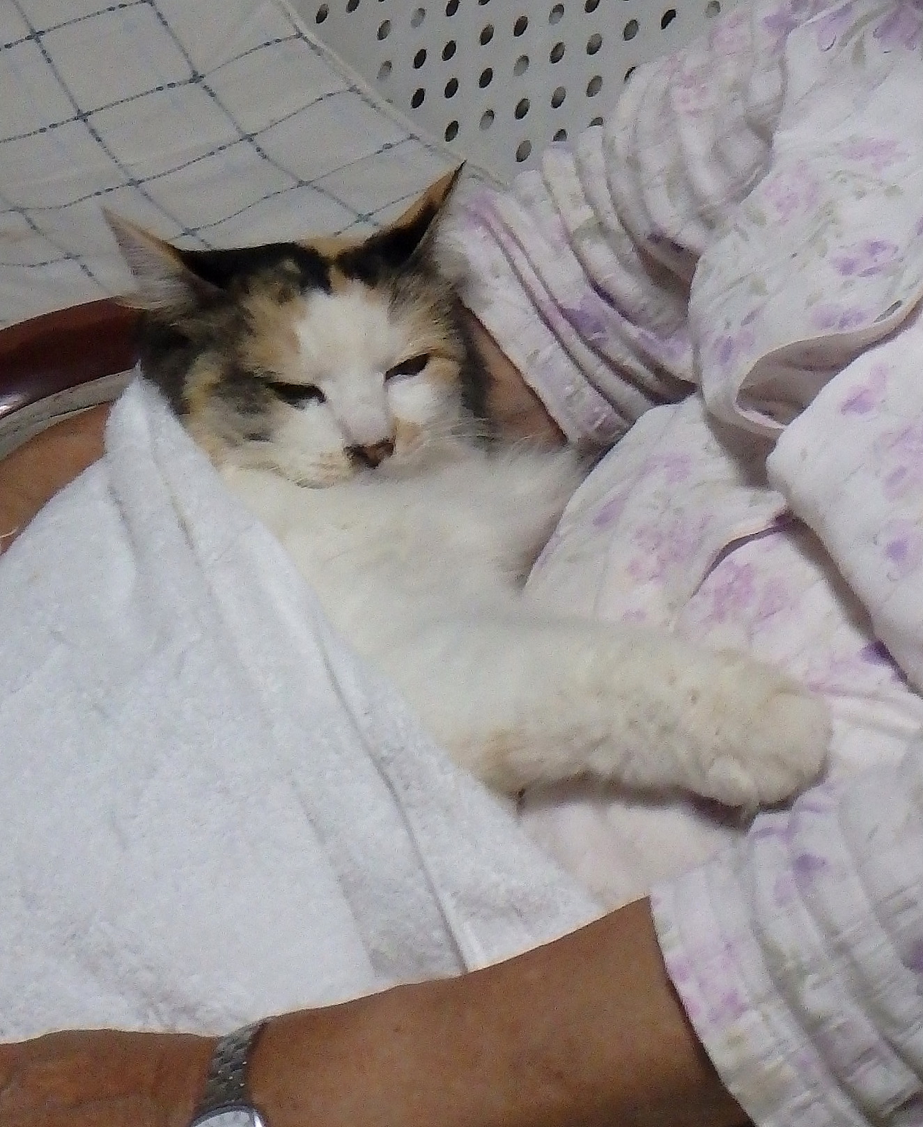 母はこの夏に腰痛圧迫骨折で動けず、ミーも遠慮してましたが、ようやくおなかの上に抱けるように回復して、甘えているミーです。