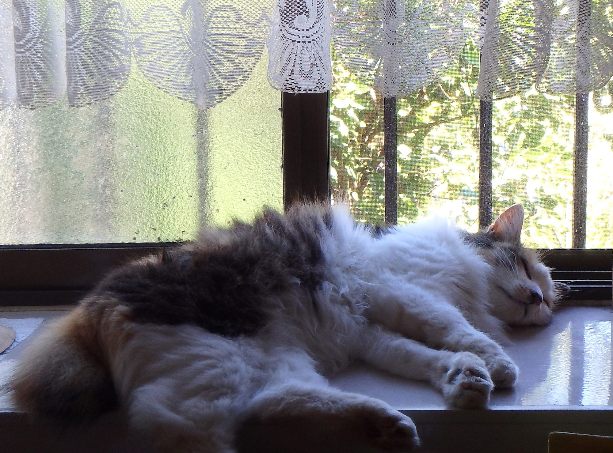 台所の出窓でくたっとしてます。自然の風が入る場所で昼寝中です。