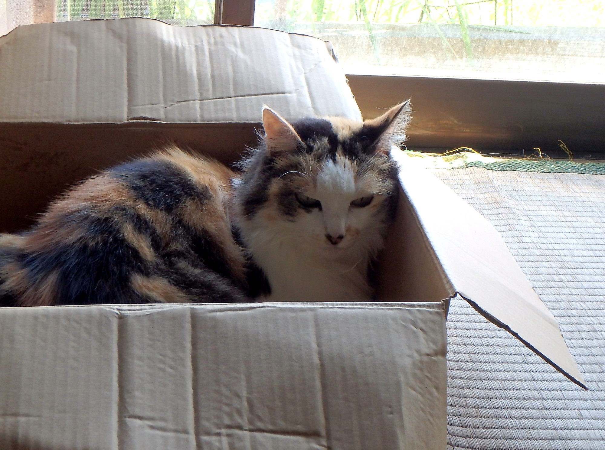 段ボールを広げていたら、いつの間にか…、猫の習性?