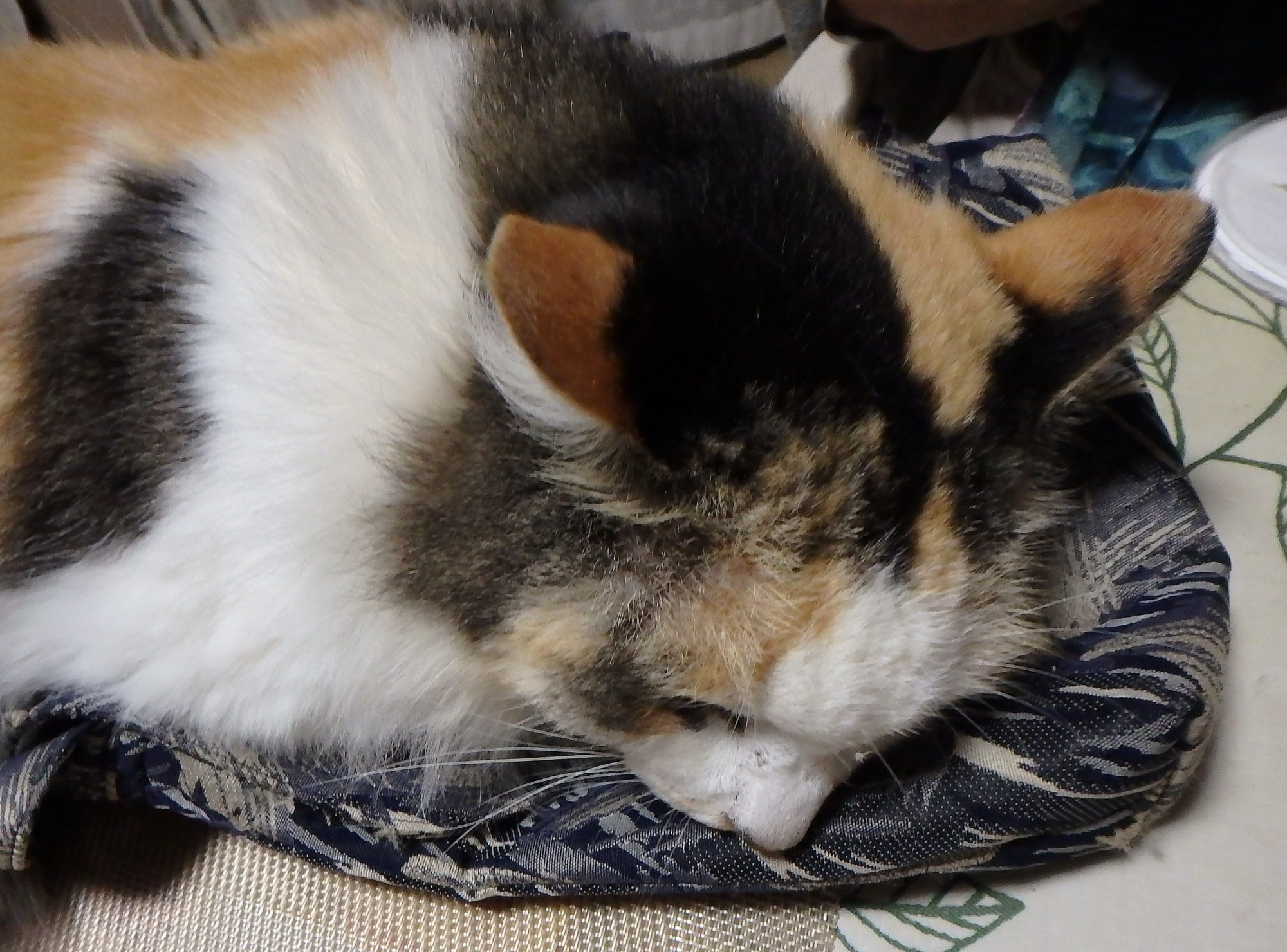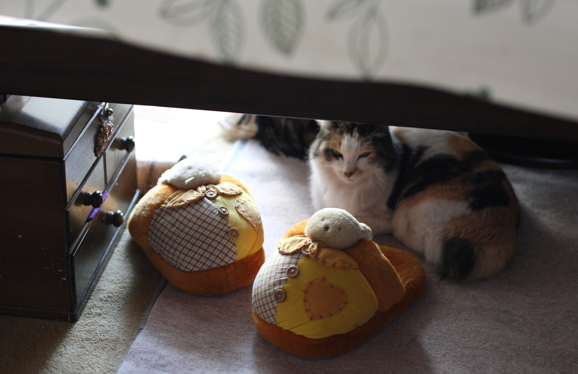テーブルの下もミーの棲息場所の一つです。電気絨毯ですので、暖かいです。スリッパと裁縫箱で、ミーはちんまり収まってます。