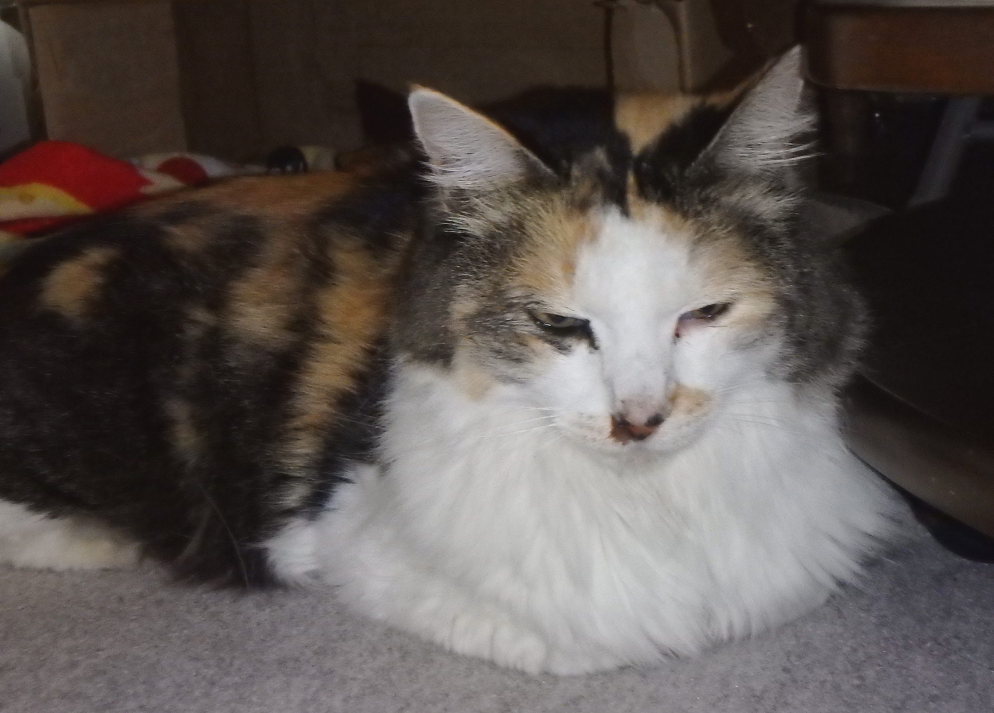 ミーは具合が悪く、動物病院にかかり、注射を打たれてどうにか持ち直しました。ぐったりしていて体も熱かったせいか、いつものこたつには入らず、納戸の板張りで丸くなってました。鼻も詰まっていたようで、私が固くなった鼻の周りの物をはがしたら、水を勢いよく飲みました。右目も涙目になってます。