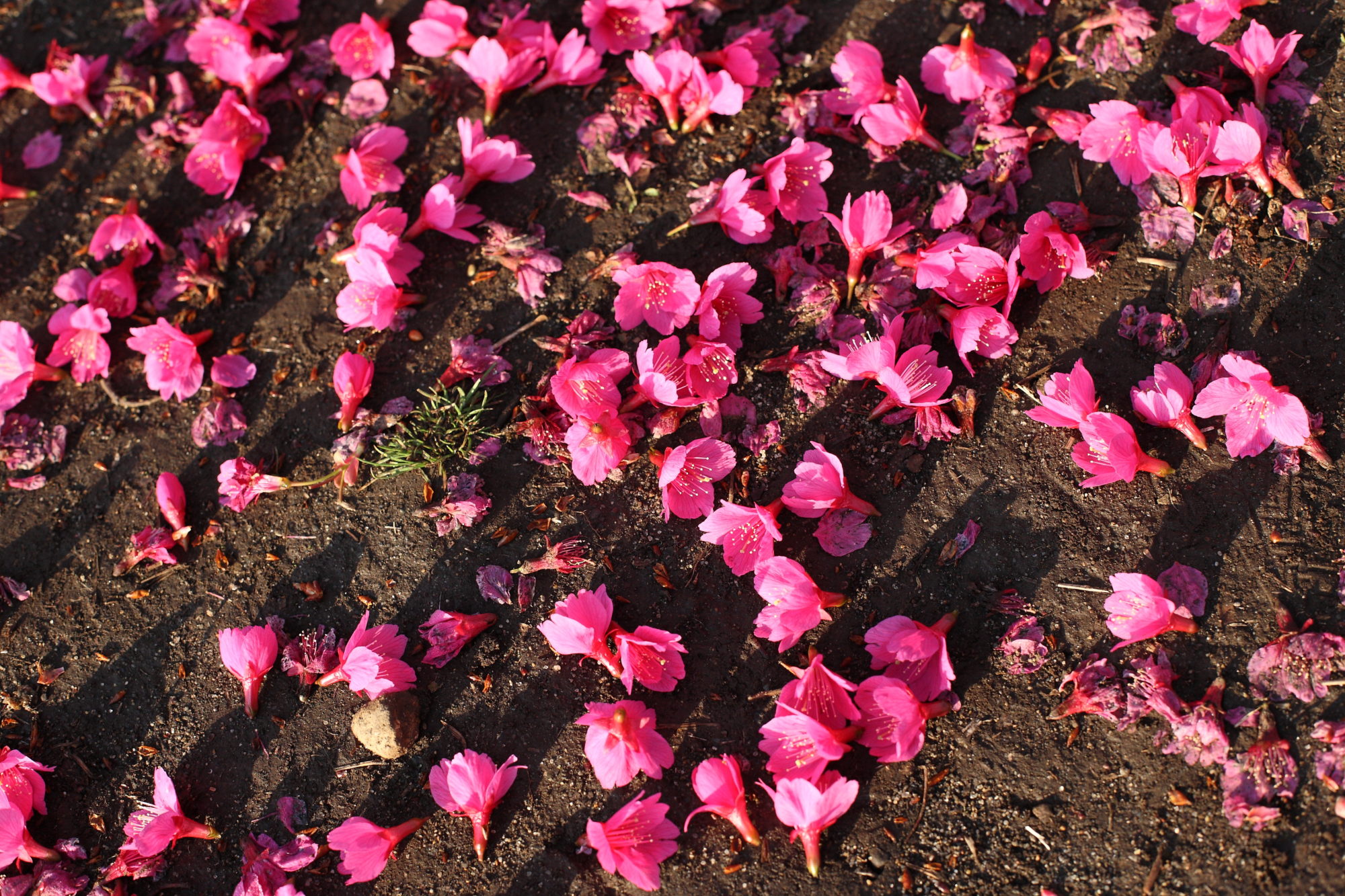 彼岸桜が、鳥の仕業でしょうか、花のまま落花です。