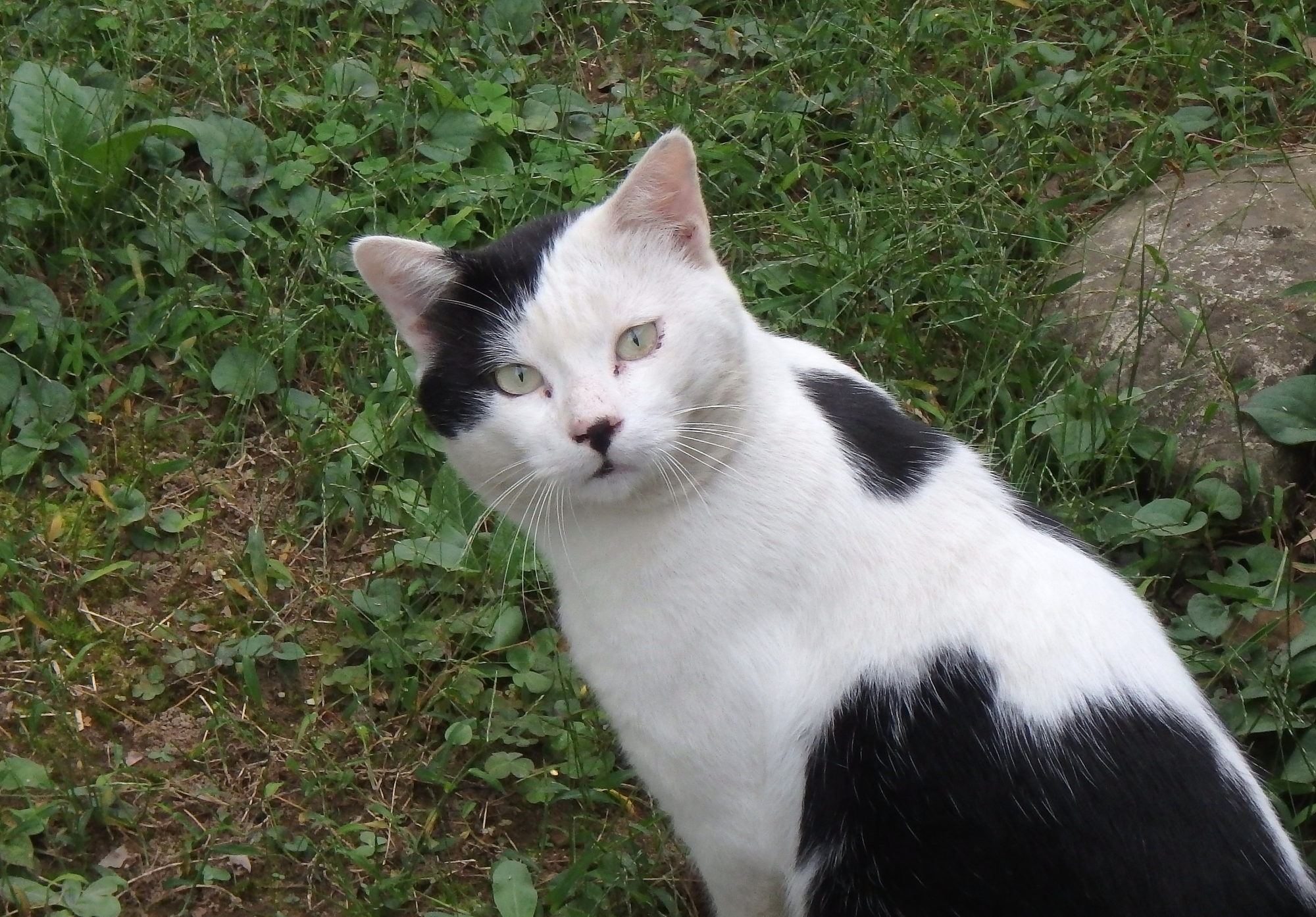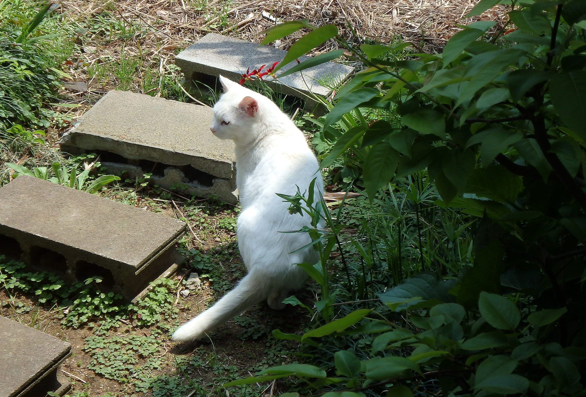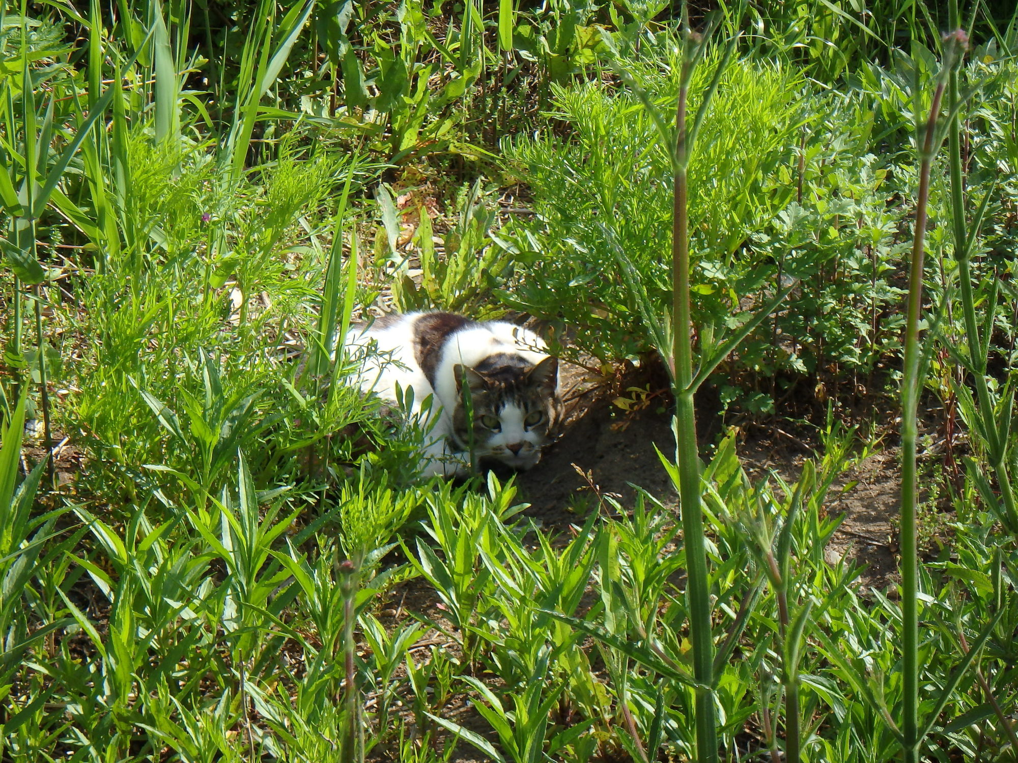 雑草の木陰で、近所の猫が寛いでました。