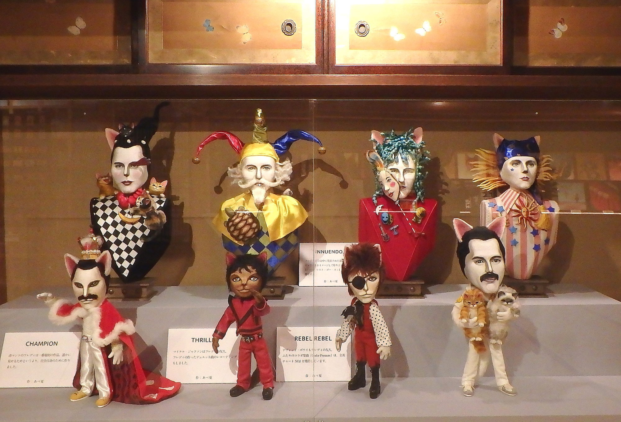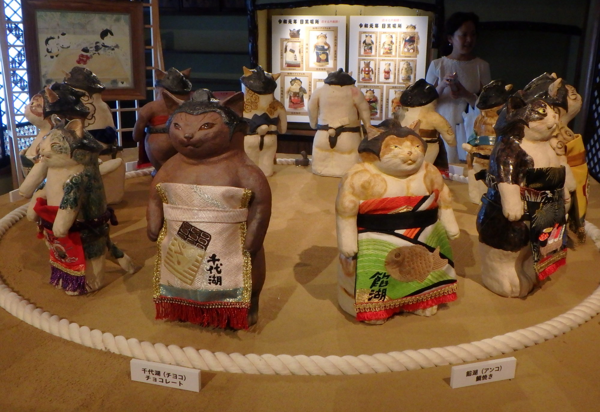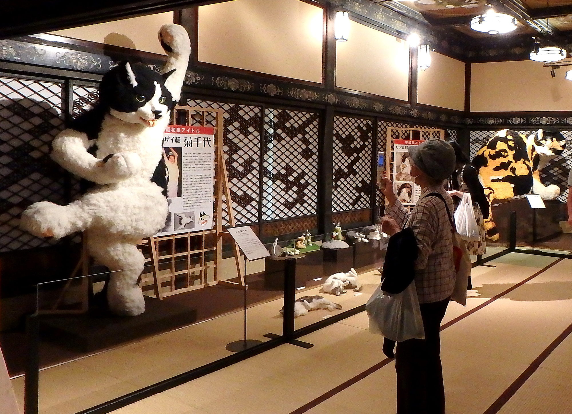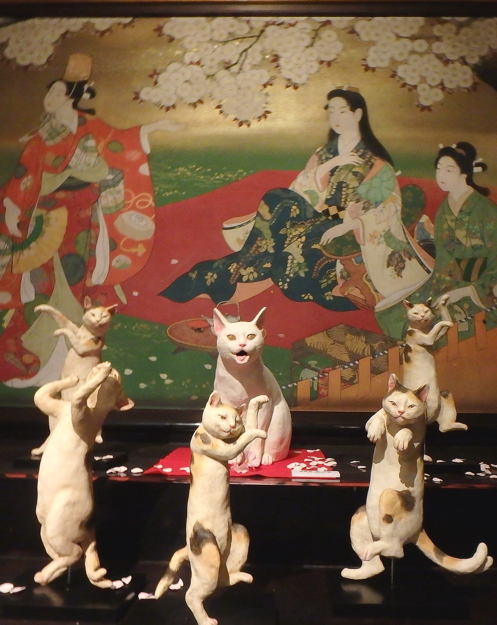 猫の鳥獣戯画、浮世絵、猫マッチラベルコレクション、猫ジャケアート、光源氏やおみくじ猫百覧会、などなど盛り沢山の猫人形たちを愉しみました。