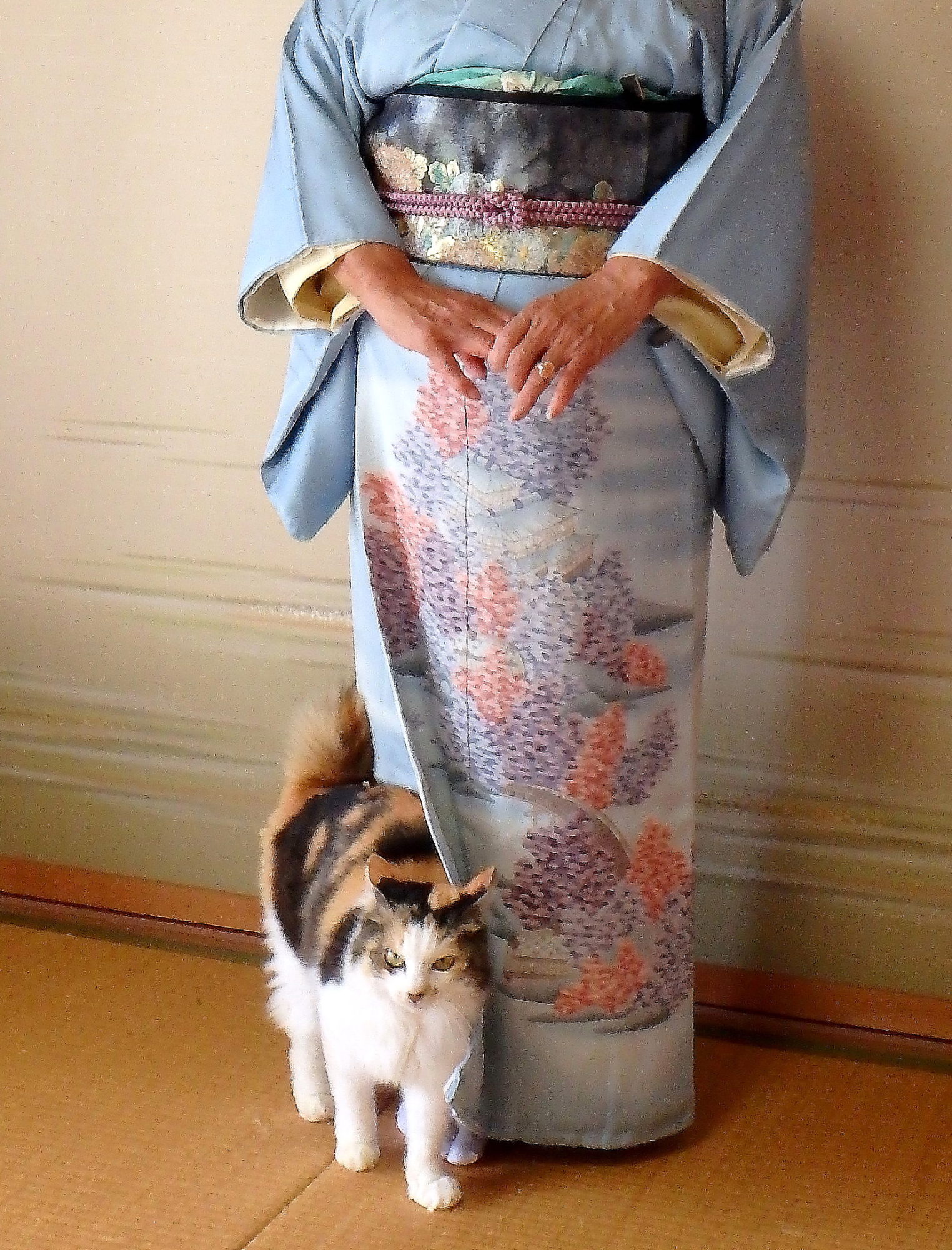 母の着物姿を撮っていたら、スリスリしてきました。目は尖ってますが…。