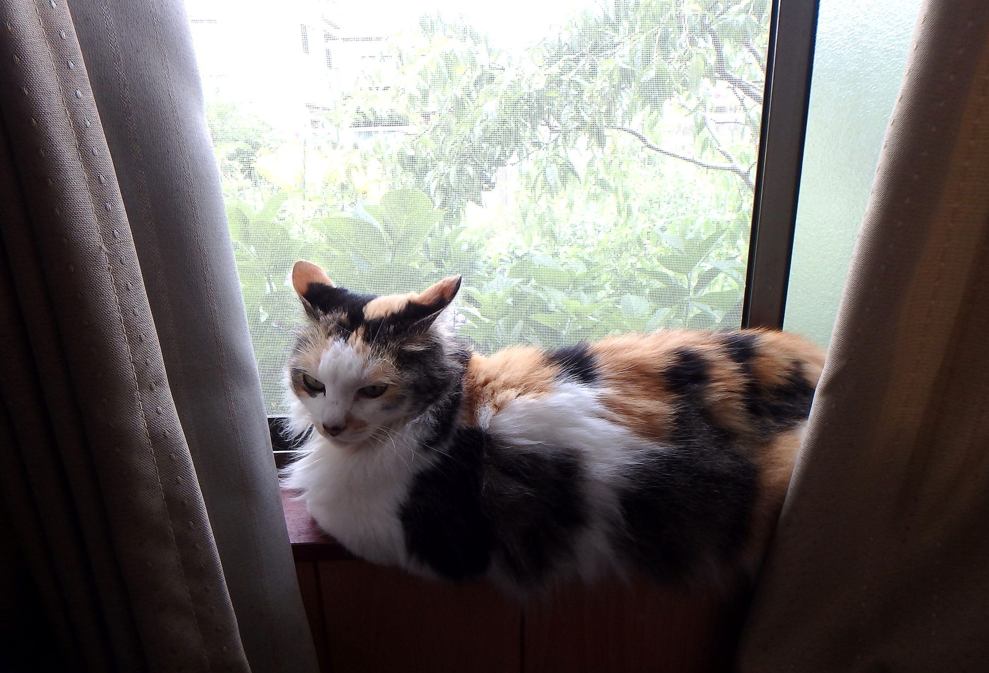 風が通る納戸の窓辺に居たのは、初めてです。隣家の庭の百合や紫陽花が、網戸越しに良く見えます。