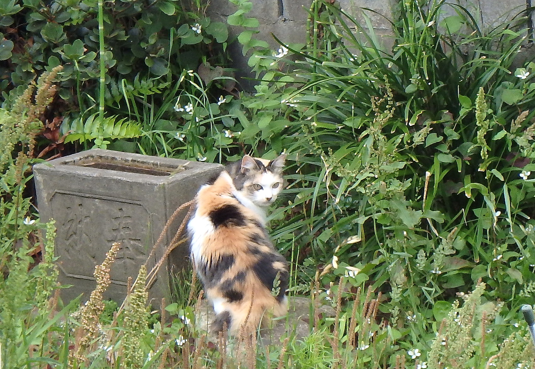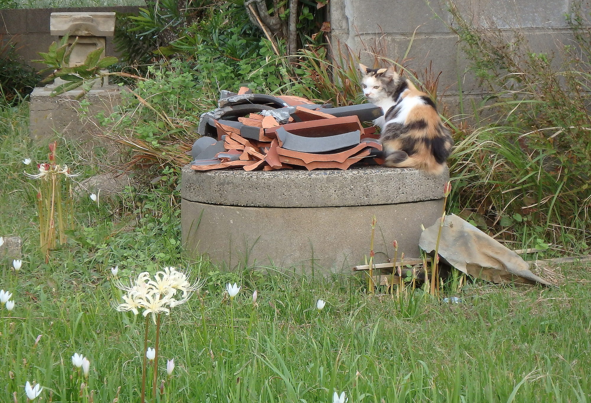 台風の強風で落ちた、隣家の瓦が積んであります。ミーは、瓦とは保護色です。白花彼岸花も咲きました。