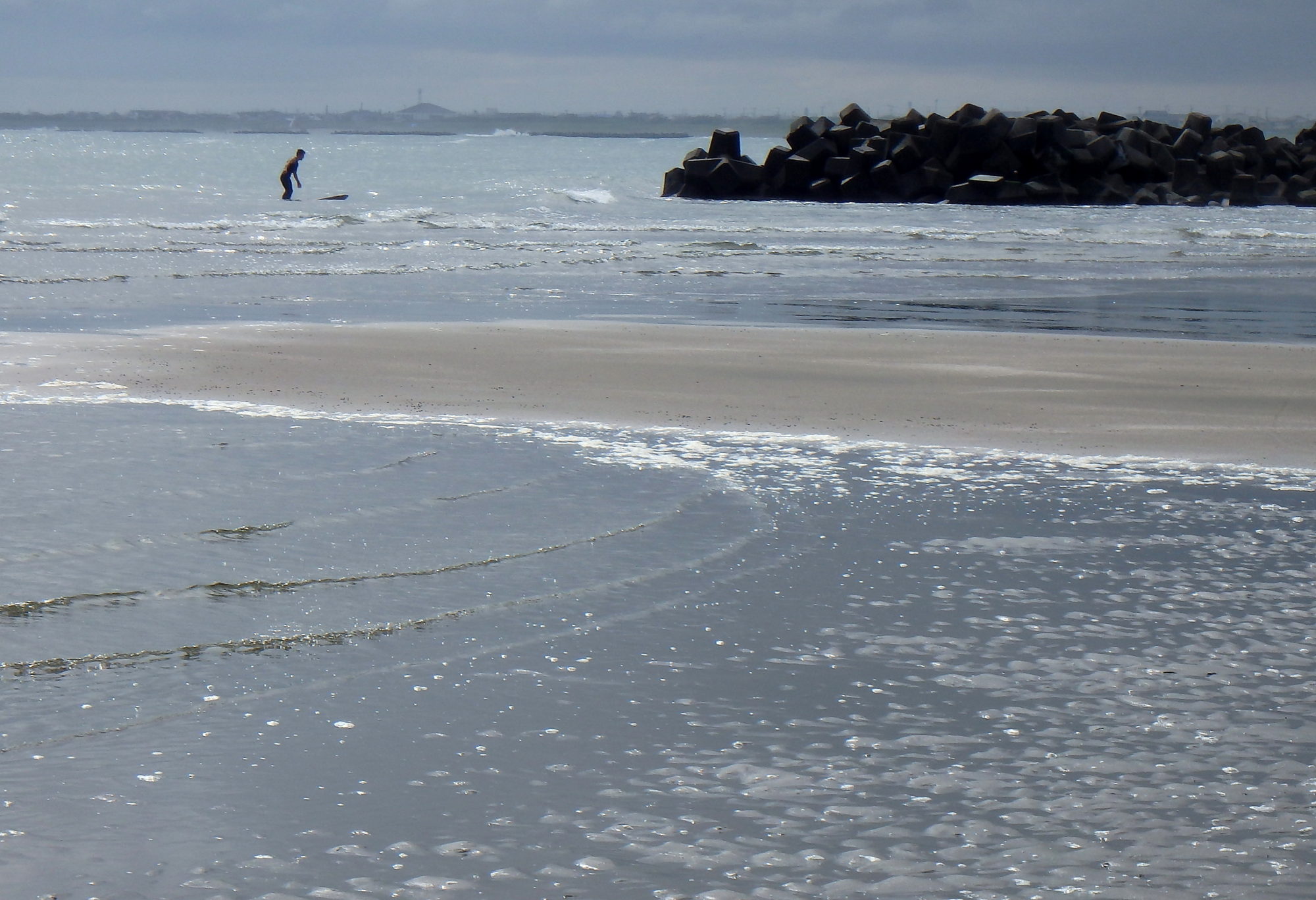 凪の海でも、サーファー。キラキラとさざ波も輝く夏の海です。