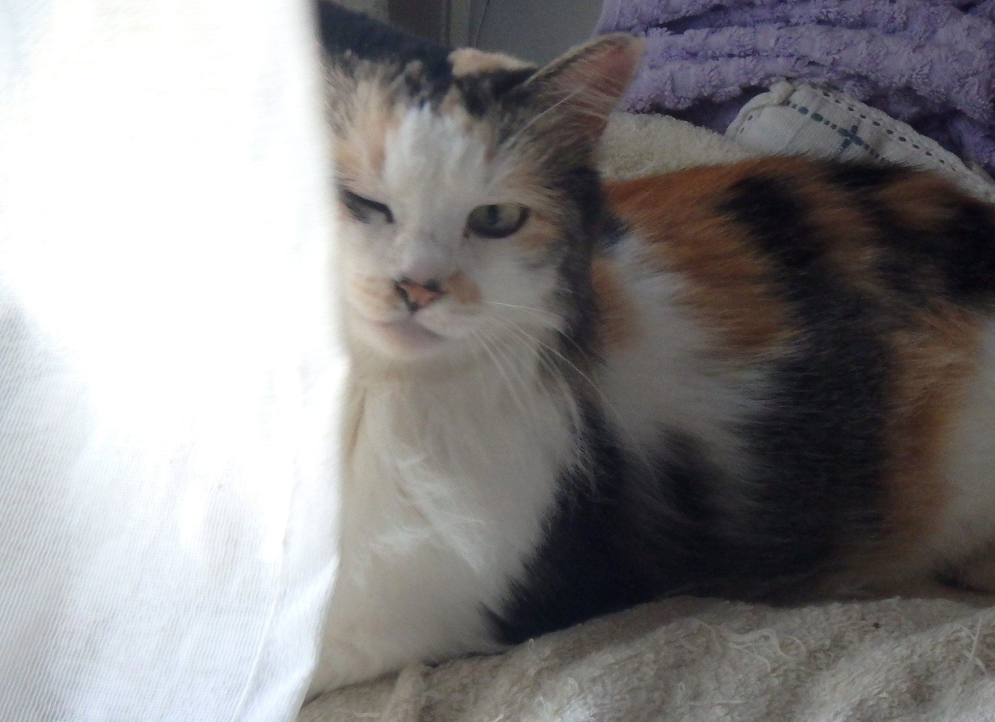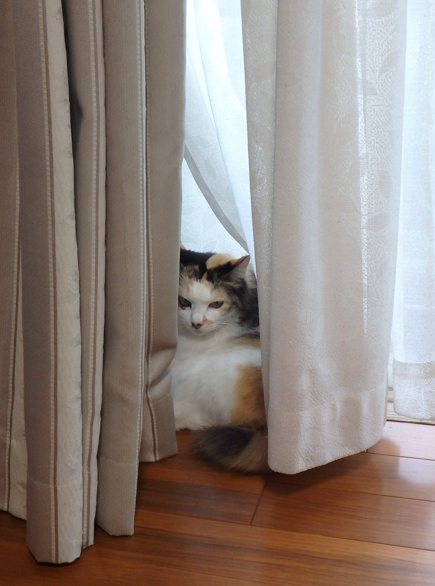 カーテンの間で、眠そうです。