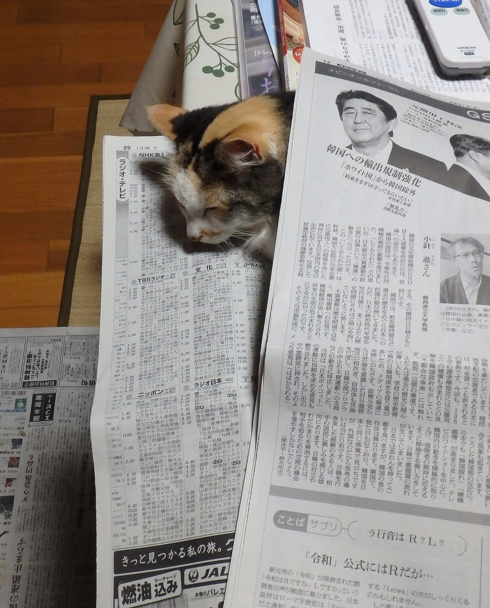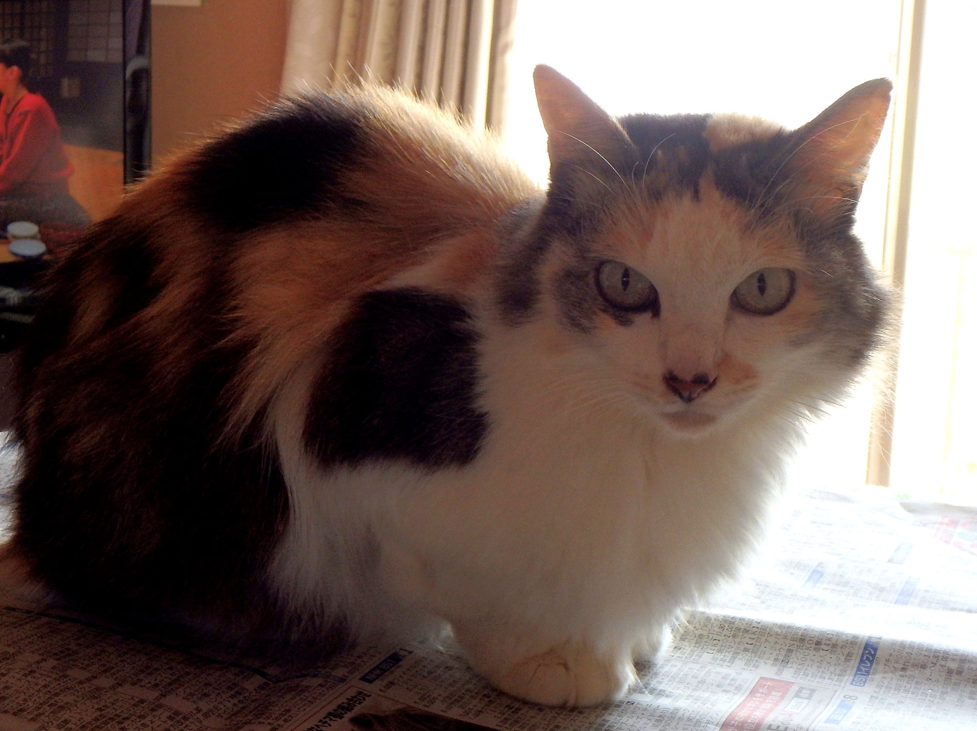 テーブルで新聞を読んでいると、飛び乗っってきたので、そのまま新聞を捲りました。