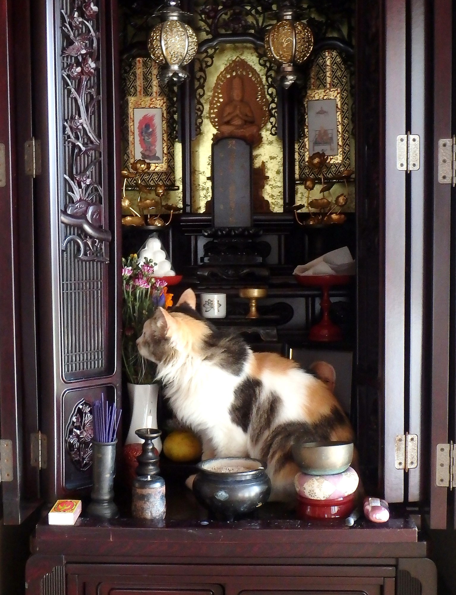 極めつけは、仏壇に入り込んでました。お彼岸の頃とはいえ、何か見えているのでしょうか?