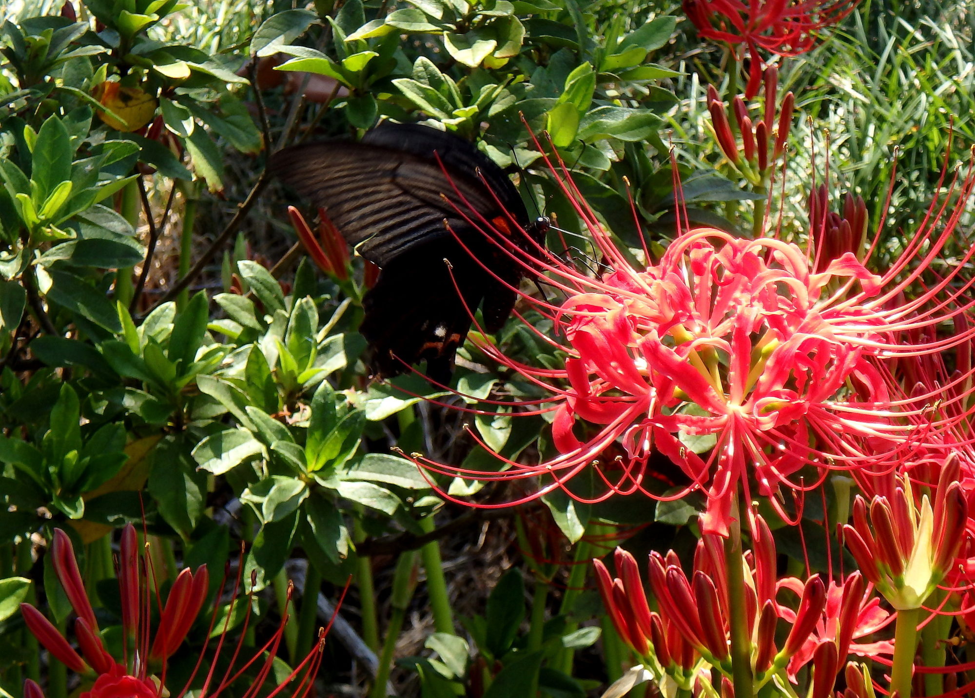 彼岸花も盛りで、蝶がしきりに飛び回っていました。赤と黒の世界。