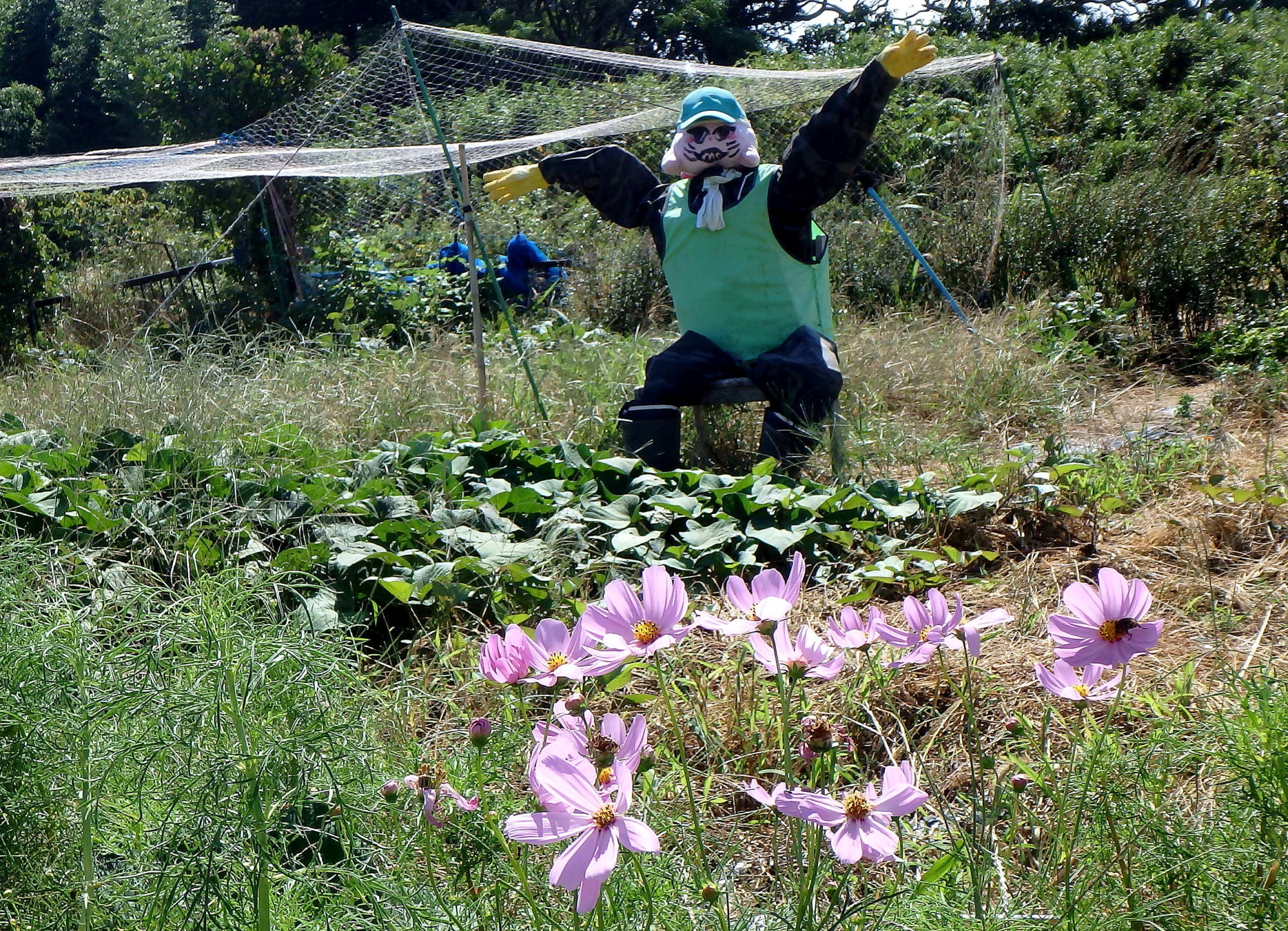 カンナも咲いてます。畑には、大きな案山子がおりました。今年の夏は暑いのかな?