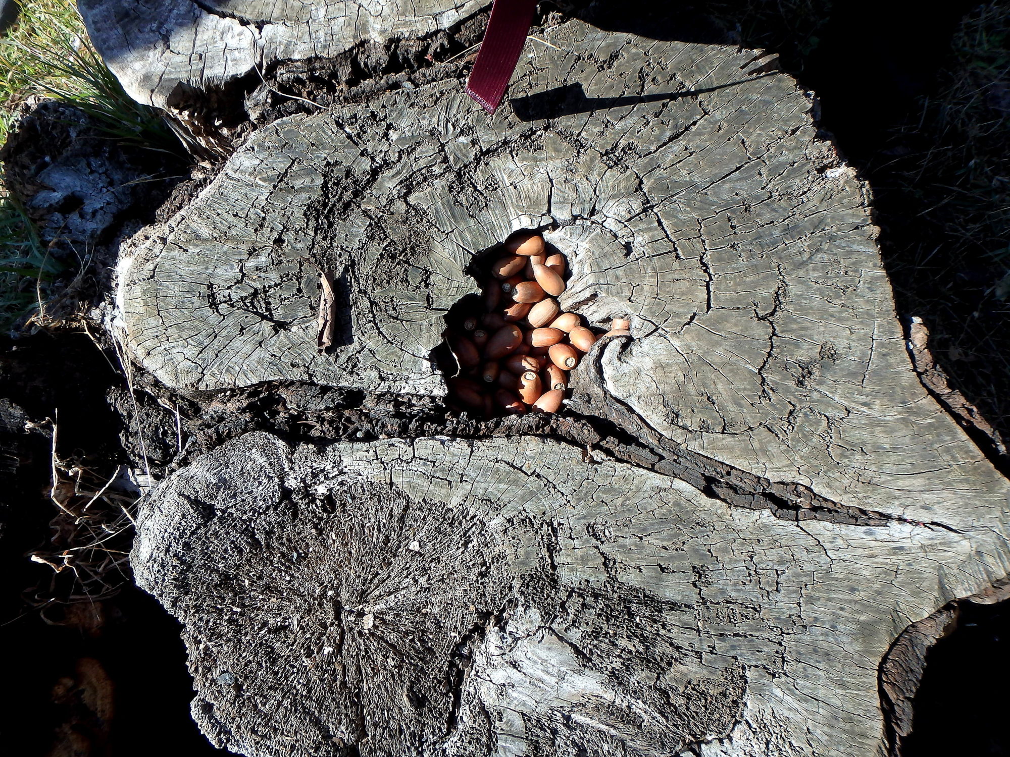 子供のいたずらでしょうか?ドングリが切り株のくぼみにハマってます。