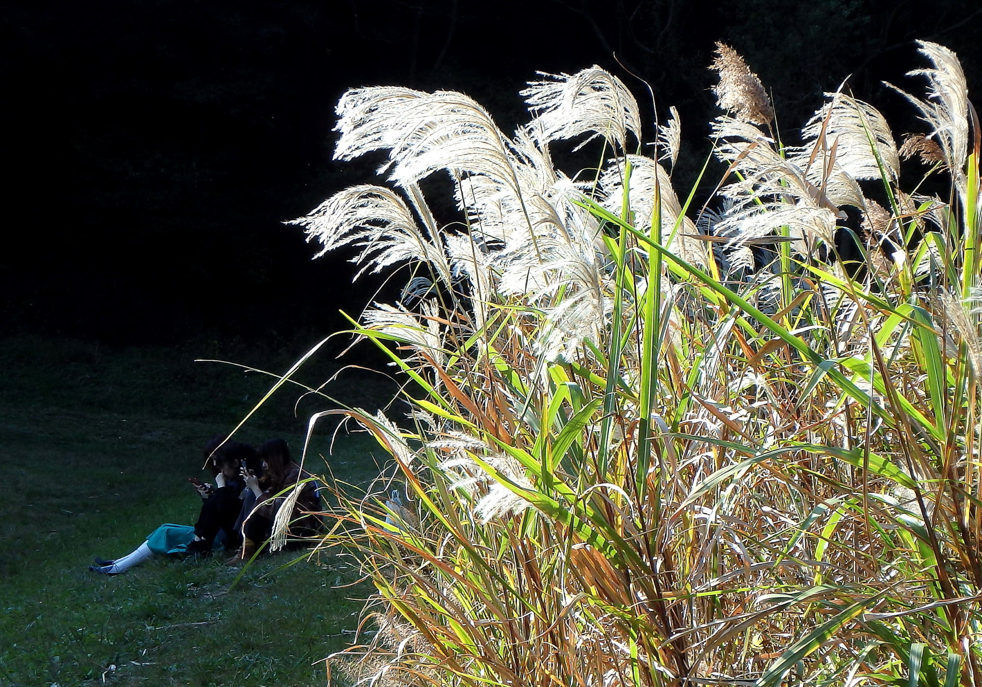 晩秋の頃、ススキは日向で輝き、スマホを見る女学生は日陰で座ってました。