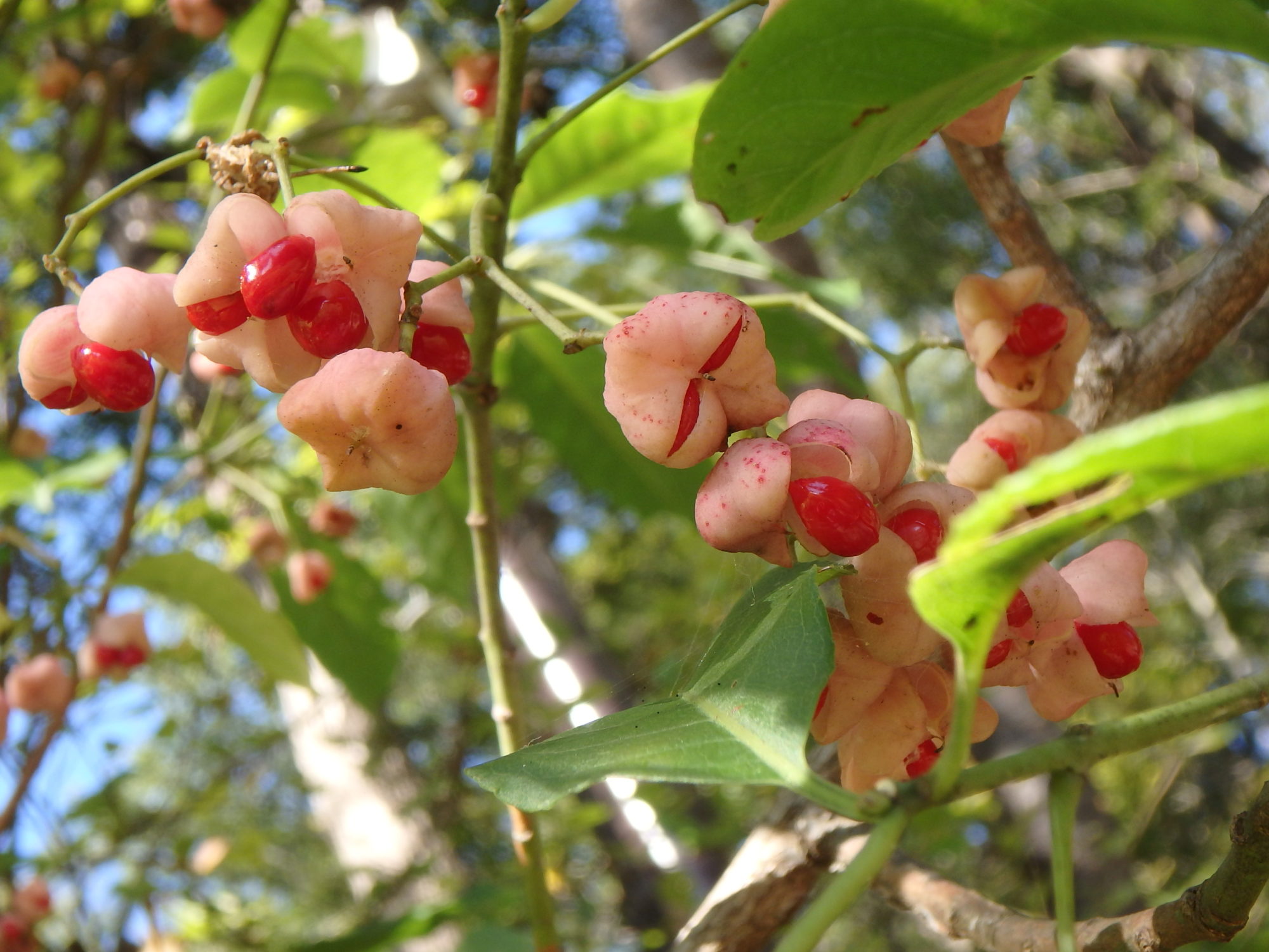 檀の実が青空に弾けてます。