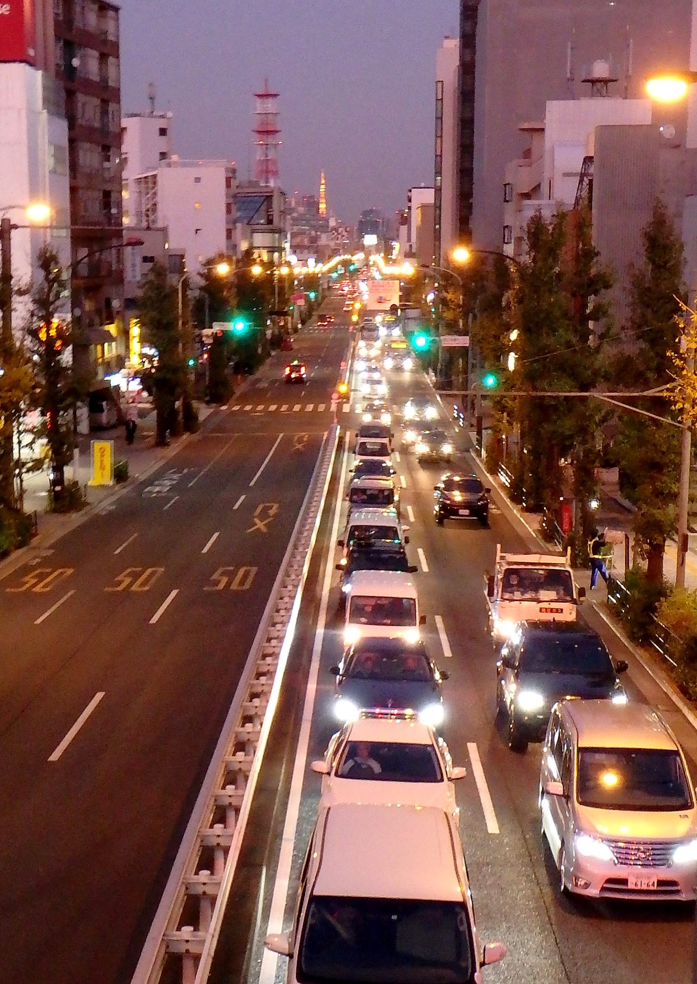 東京タワーを遠望できる通りです。タワーの灯りが、暖かく感じる季節です。
